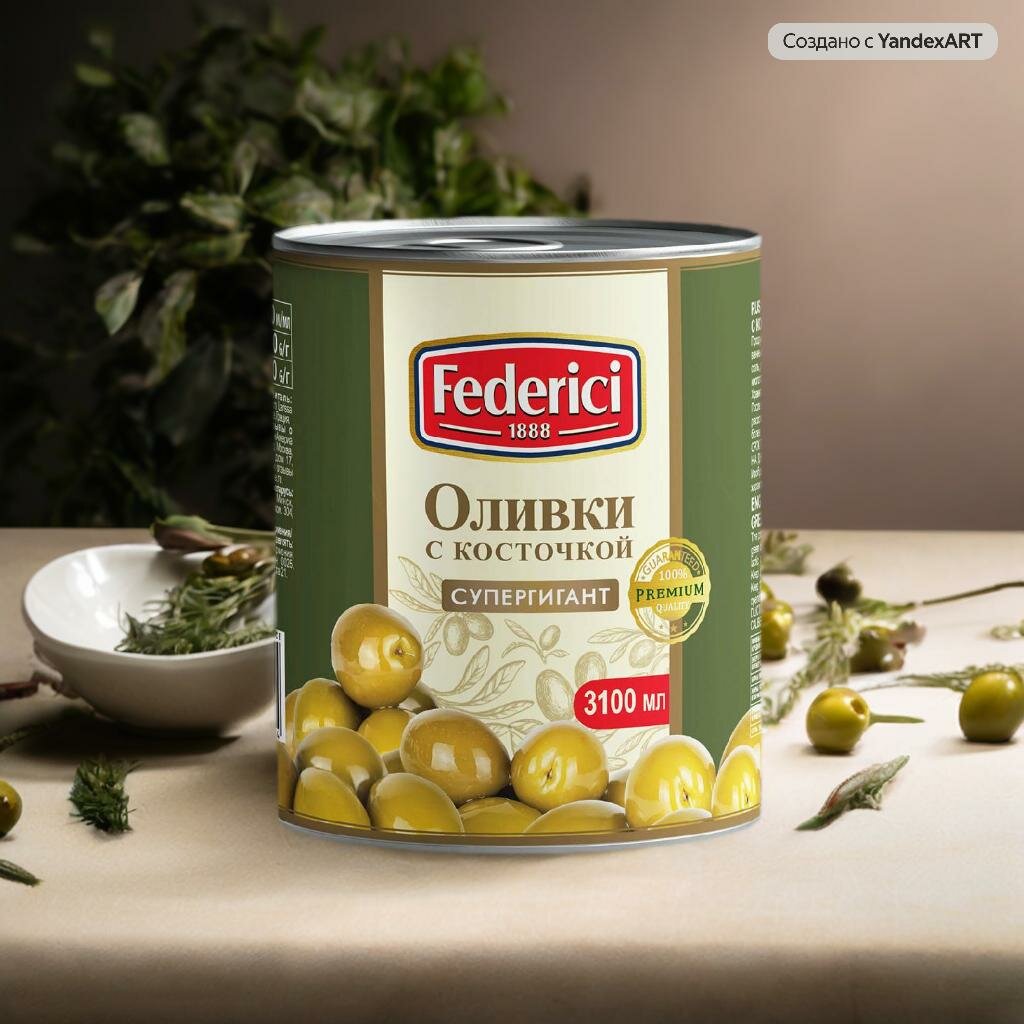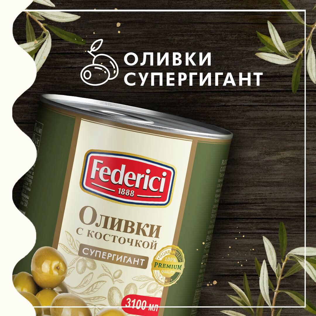 Оливки Federici Супергигант, с косточкой, жестяная банка, 3кг