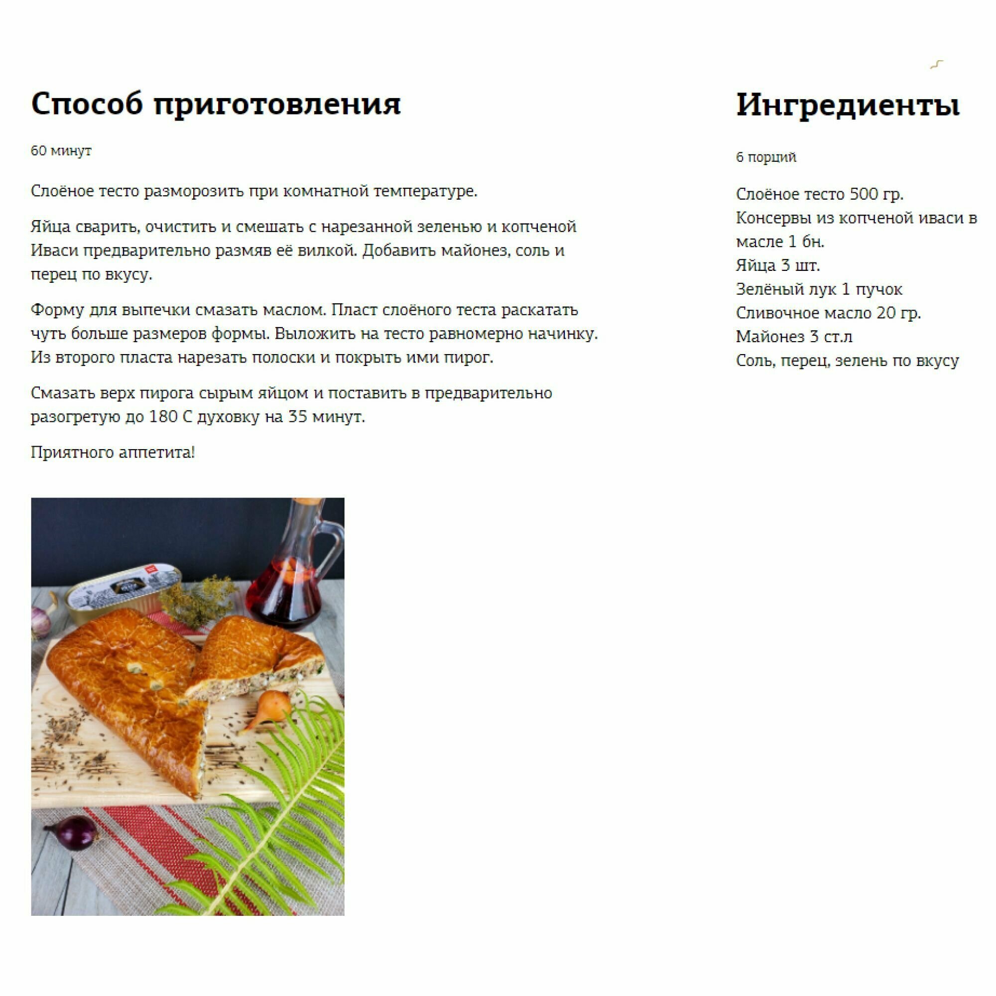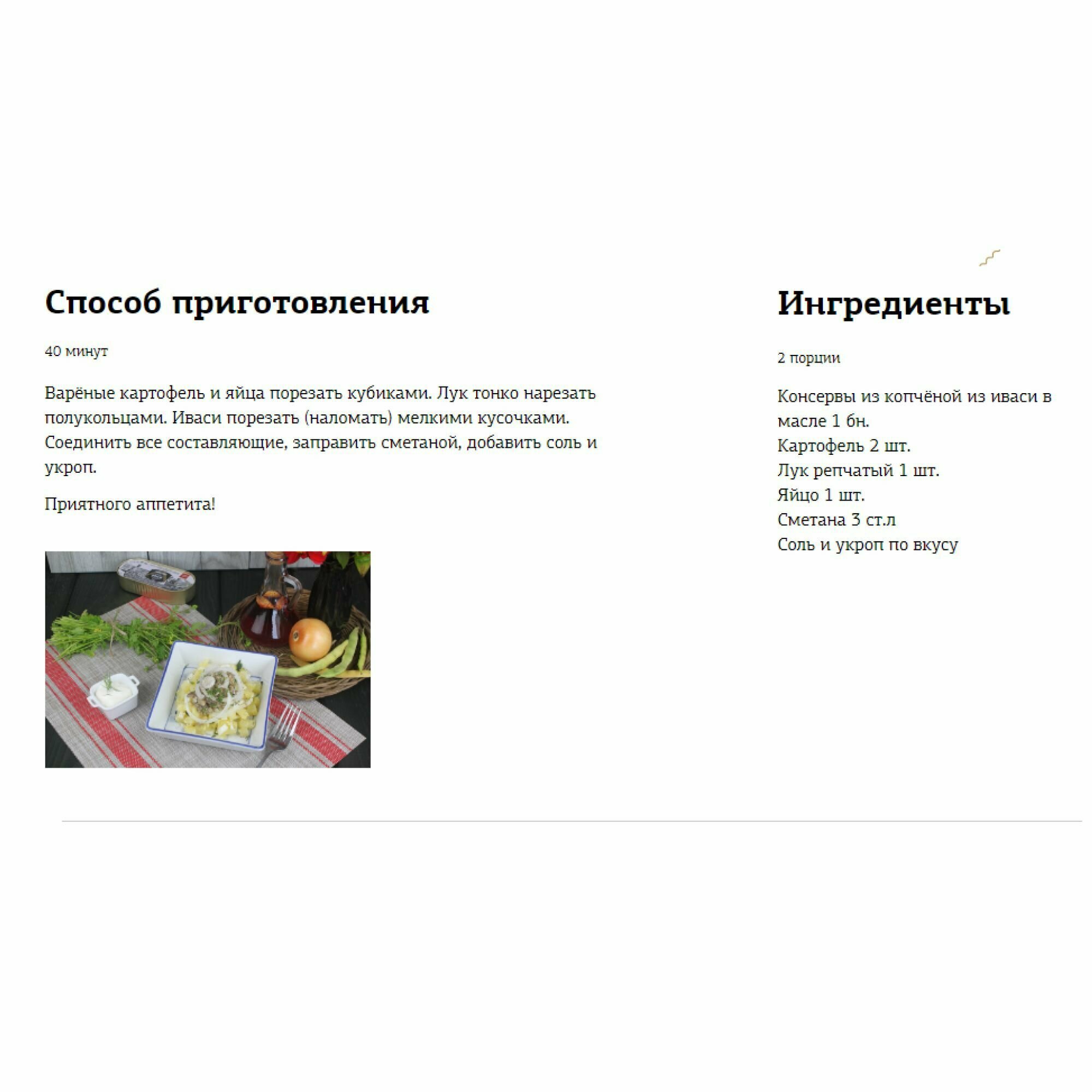 | Состав | сардина тихоокеанская (иваси), соль пищевая, масло соевое рафинированное дезодорированное |