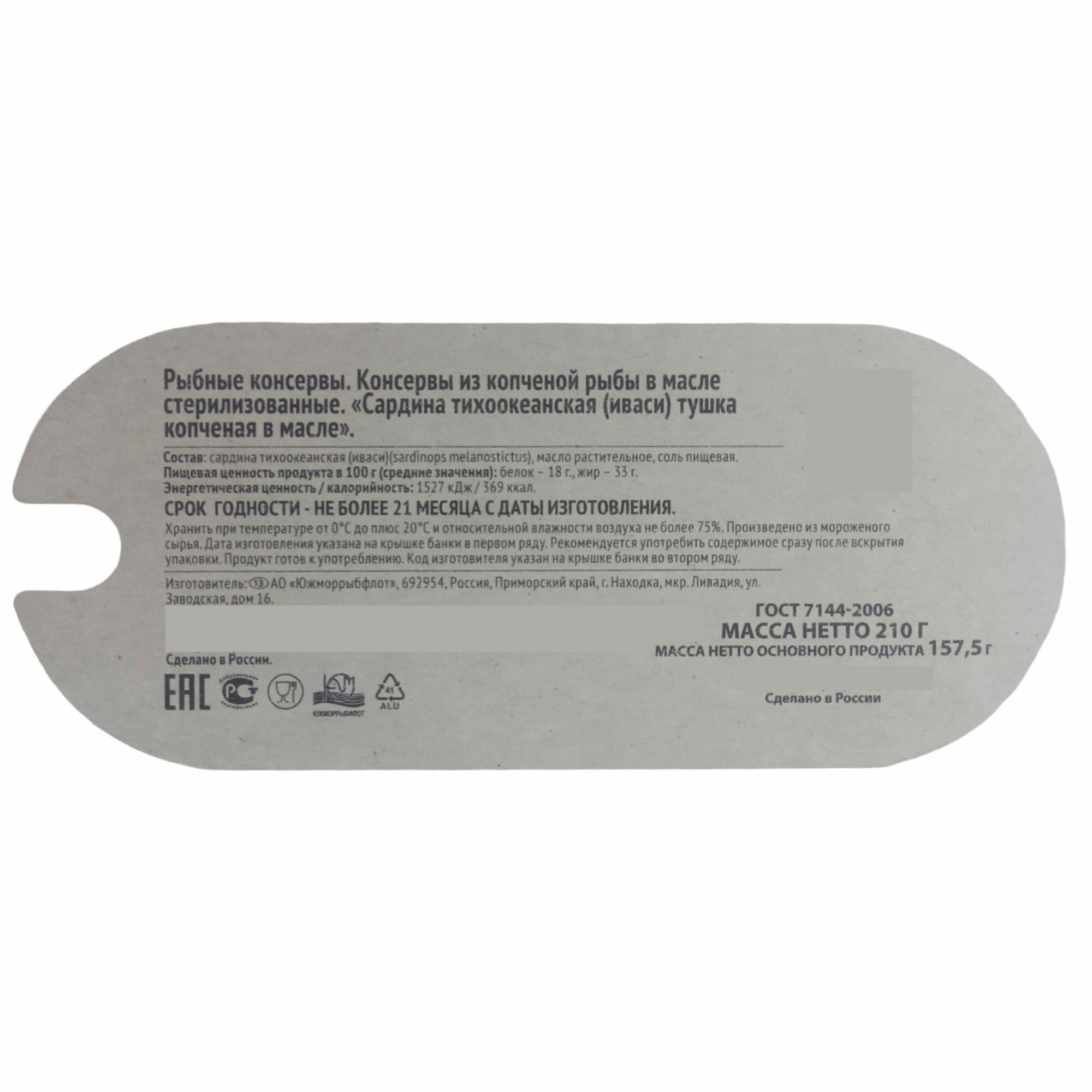 Сардина иваси копченая в масле(тушка), тихоокеанская, Доброфлот, 1 шт. по 210 г