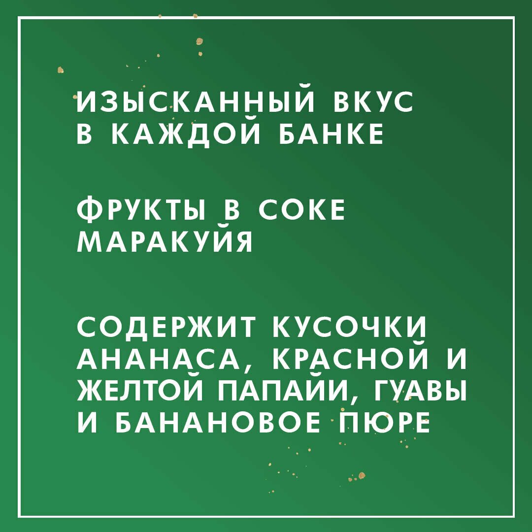 | Состав | кусочки ананаса, кусочки красной папайи, кусочки желтой папайи, вода питьевая, сахар, кусочки гуавы, свежеотжатый сок маракуйи, банановое пюре, регулятор кислотности: лимонная кислота |