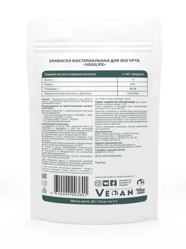 | Состав | Йогурт: Мальтодекстрин (носитель), Streptococcus salivarius ssp. thermophilus, Lactobacillus delbrueckii ssp. bulgaricus, Lactobacillus casei Йогурт Веган: Streptococcus salivarius ssp. thermophilus, Lactobacillus delbrueckii ssp. bulgaricus, Lactobacillus casei. |