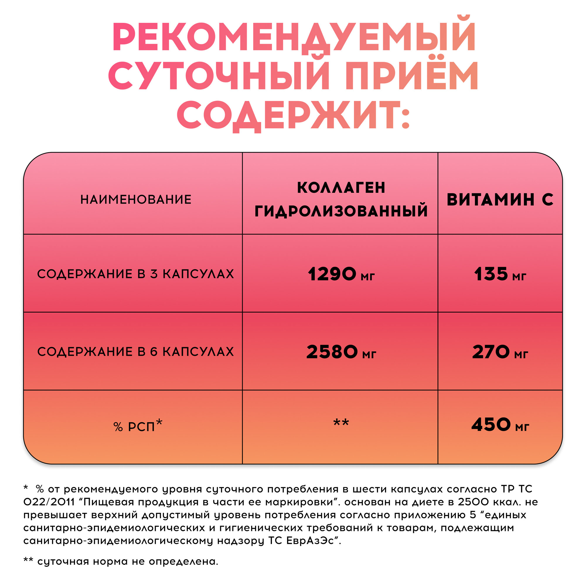 | Дополнительная информация | ускорение регенерации ослабленных и поврежденных элементов хрящей, сухожилий, мышц и кожи; рекомендации по применению: суточная норма не определена; состав: гидролизованный коллаген; аскорбиновая кислота; желатин; вода; диоксид титана; энергетическая ценность на 100 г: 0 |