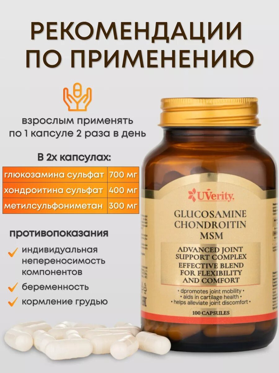 Комплекс хондроитин + глюкозамин + МСМ "UVerity", для суставов, 100 капсул, Россия интересное: