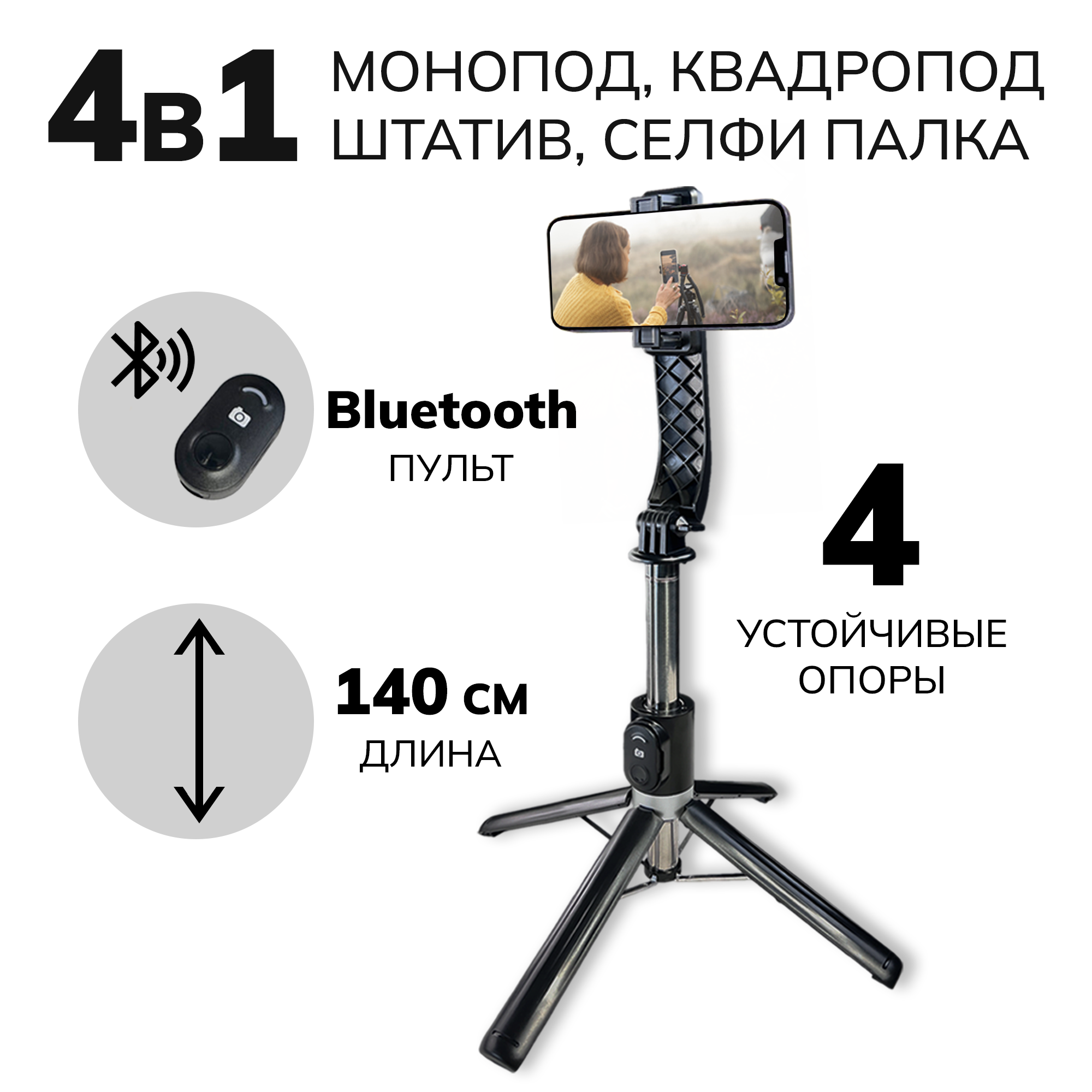 | Особенности | Bluetooth, аккумулятор, пульт ДУ, с поворотом, удлинительная штанга |
