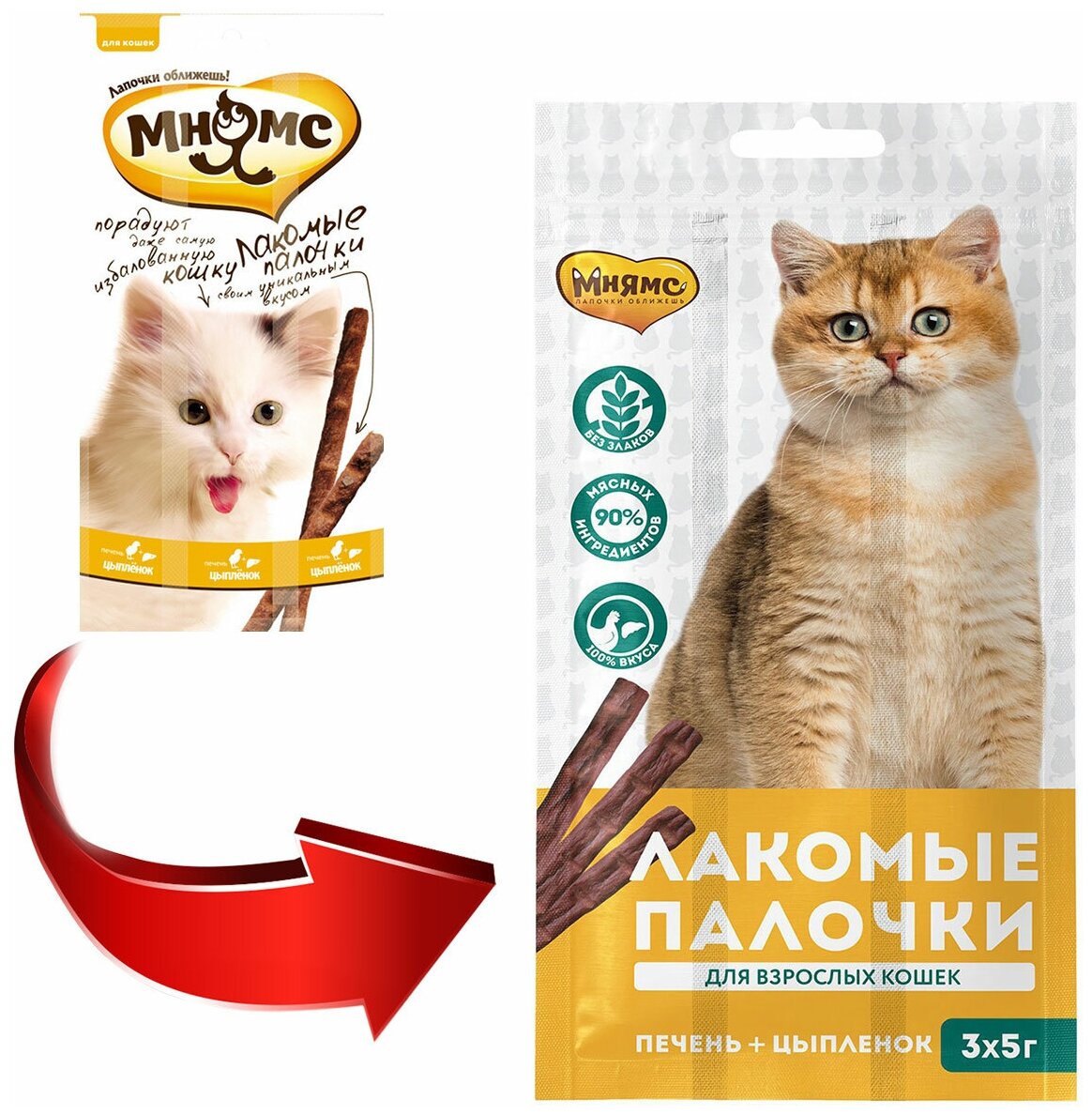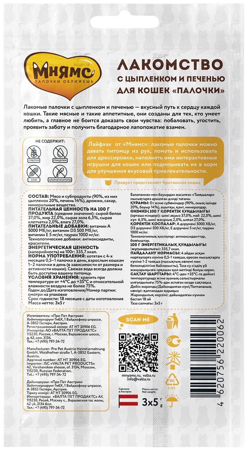 Лакомство мнямс палочки с цыпленком и печенью для кошек (5 г/3 шт) интересное: