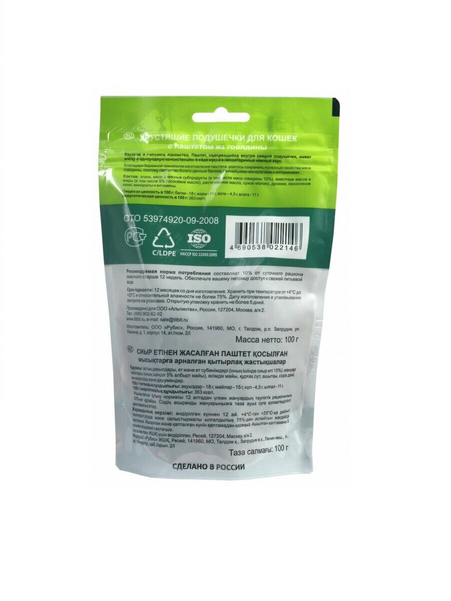 СохранитьЛакомство титбит для кошек, хрустящие подушечки с паштетом из говядины 100 г интересное: