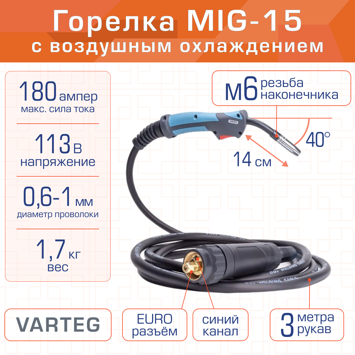 Горелка (рукав) евро MIG-15 3м 180А воздушное охлаждение Varteg