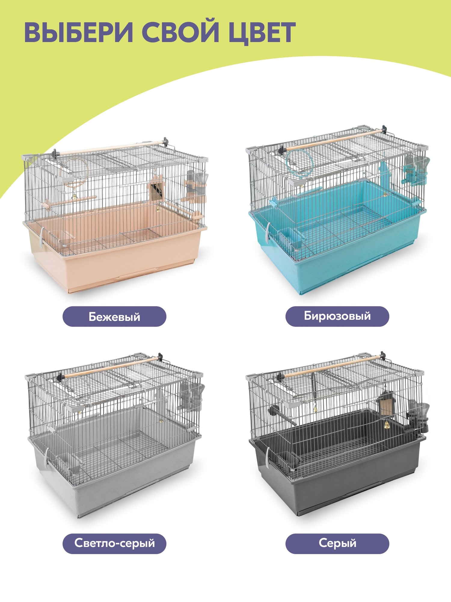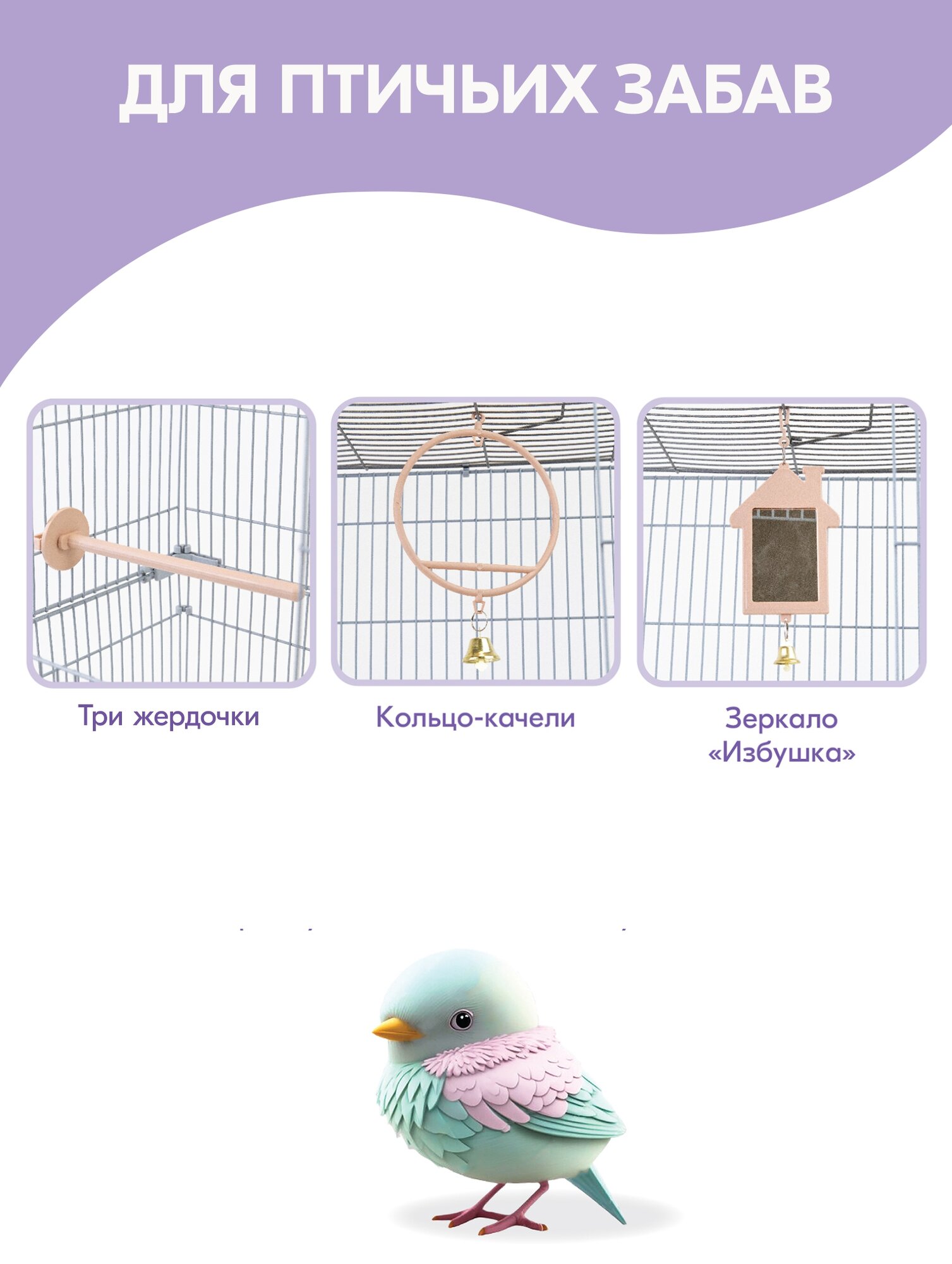 | В комплекте | ванночка / жёрдочка / зеркальце / качели / кормушка / лесенка / миска / поилка |
