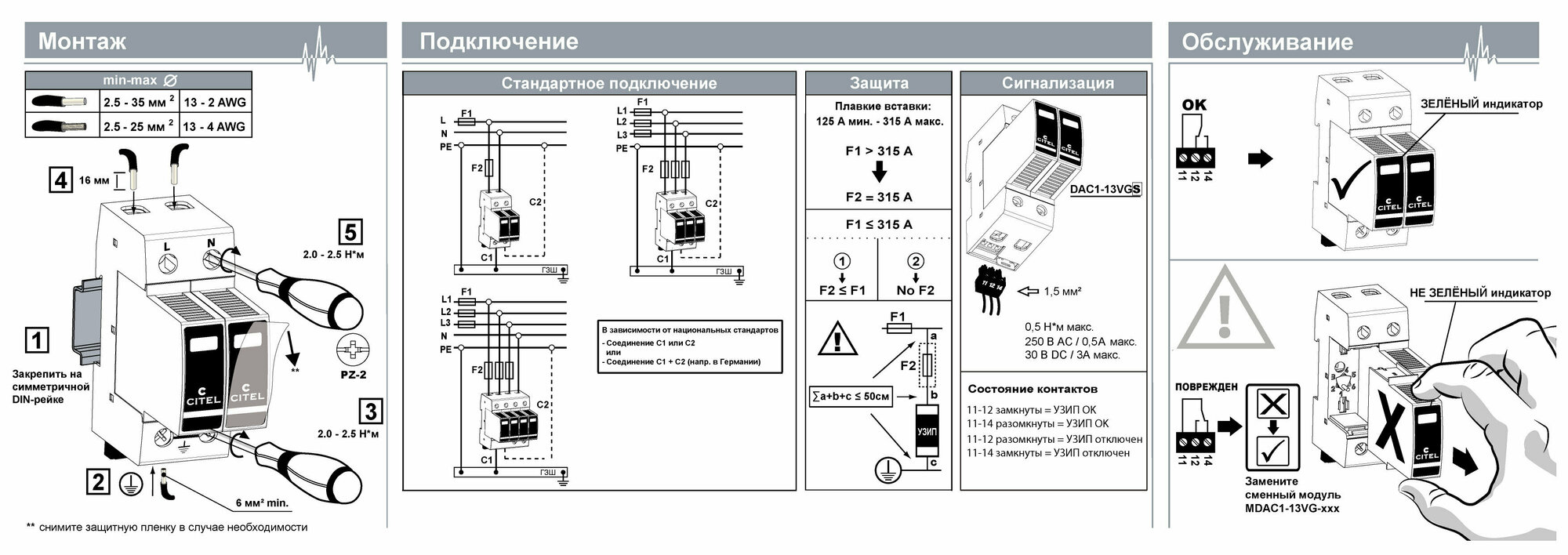 УЗИП CITEL DAC1-13VG-11-275 (821730232), комбинированного типа 1+2+3, защита однофазной сети TT или TNS, Imax 50кА, без дистанционной сигнализации выхода из строя, технология VG интересное: