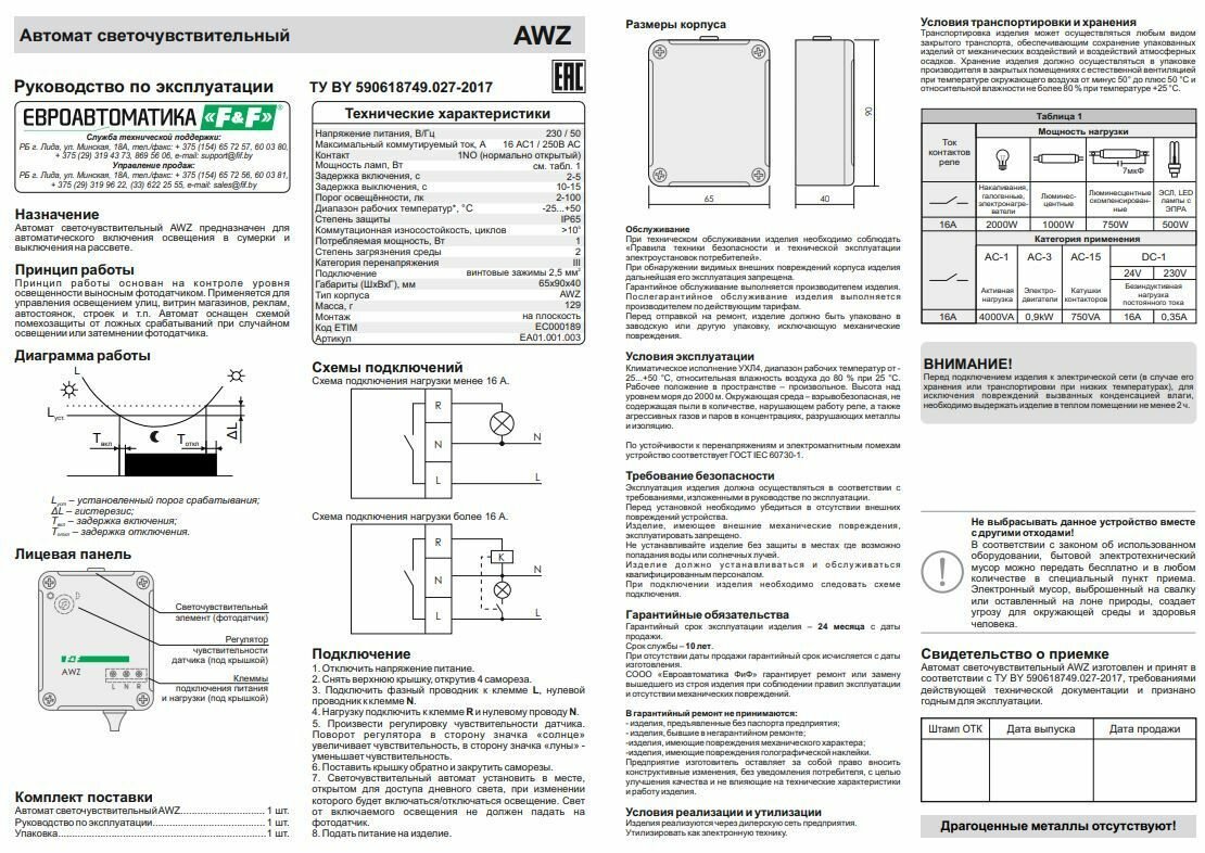 Евроавтоматика Фотореле AWZ, герметичный со встроенным фотодатчиком и внутренним подключением интересное: