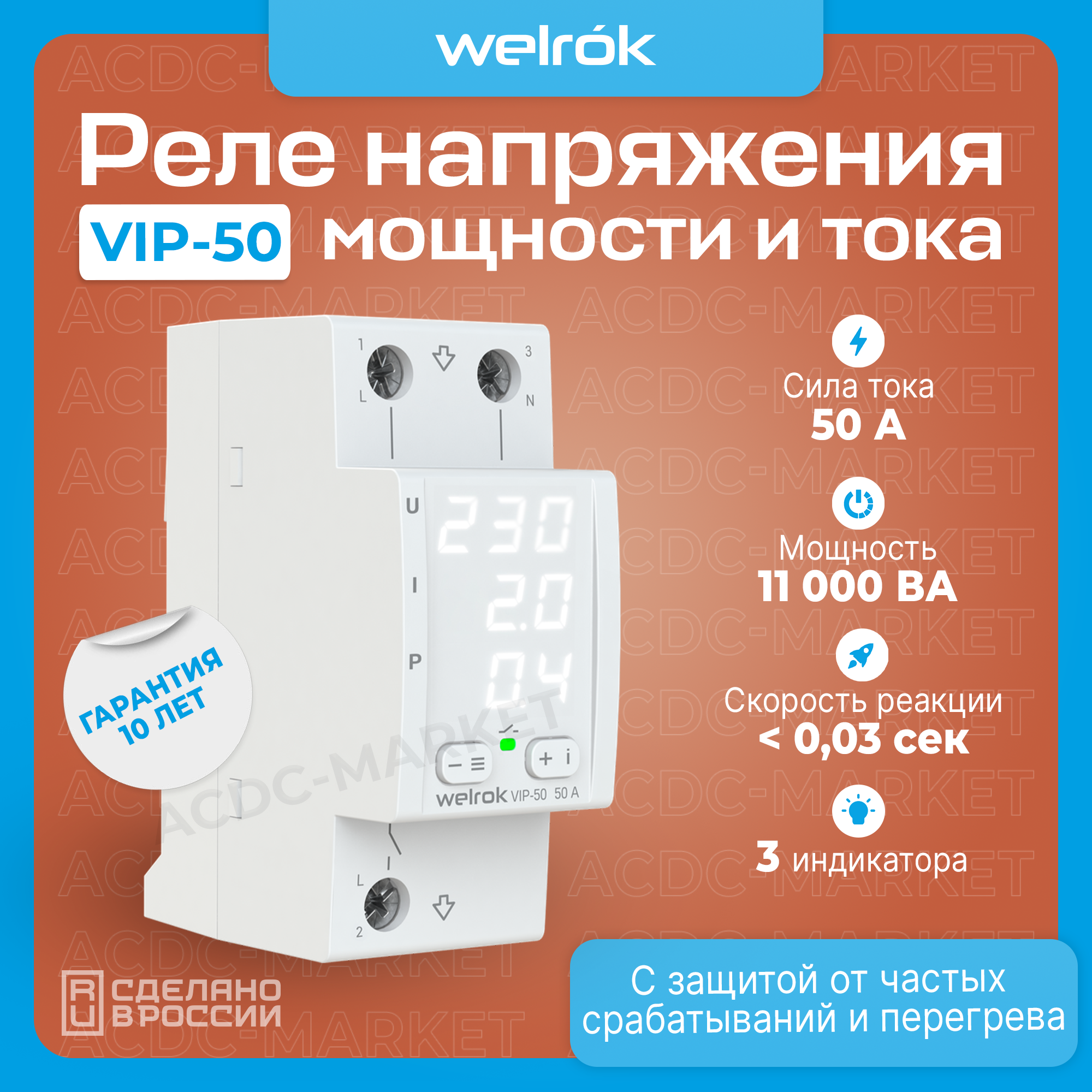 Welrok VIP-50 Реле напряжения с контролем тока 50 А (max 60 A), 11 000 ВА