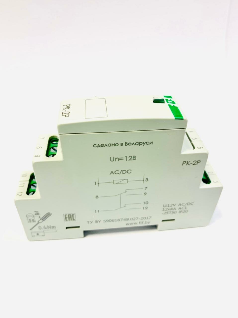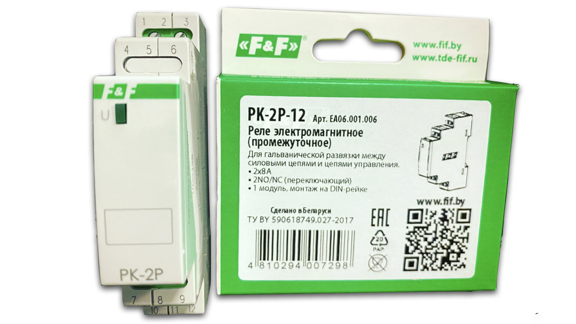 FIF EA06.001.006 PK-2P/12 12В АС/DC, 8А, 2 переключающих, 1 модуль, монтаж на DIN-рейке
