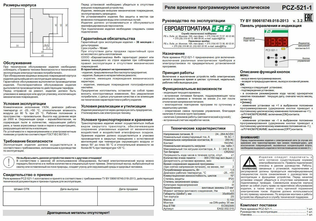 | Комплектация | Реле времени F&F PCZ-521-1 программируемый таймер EA02.002.010 -1шт |