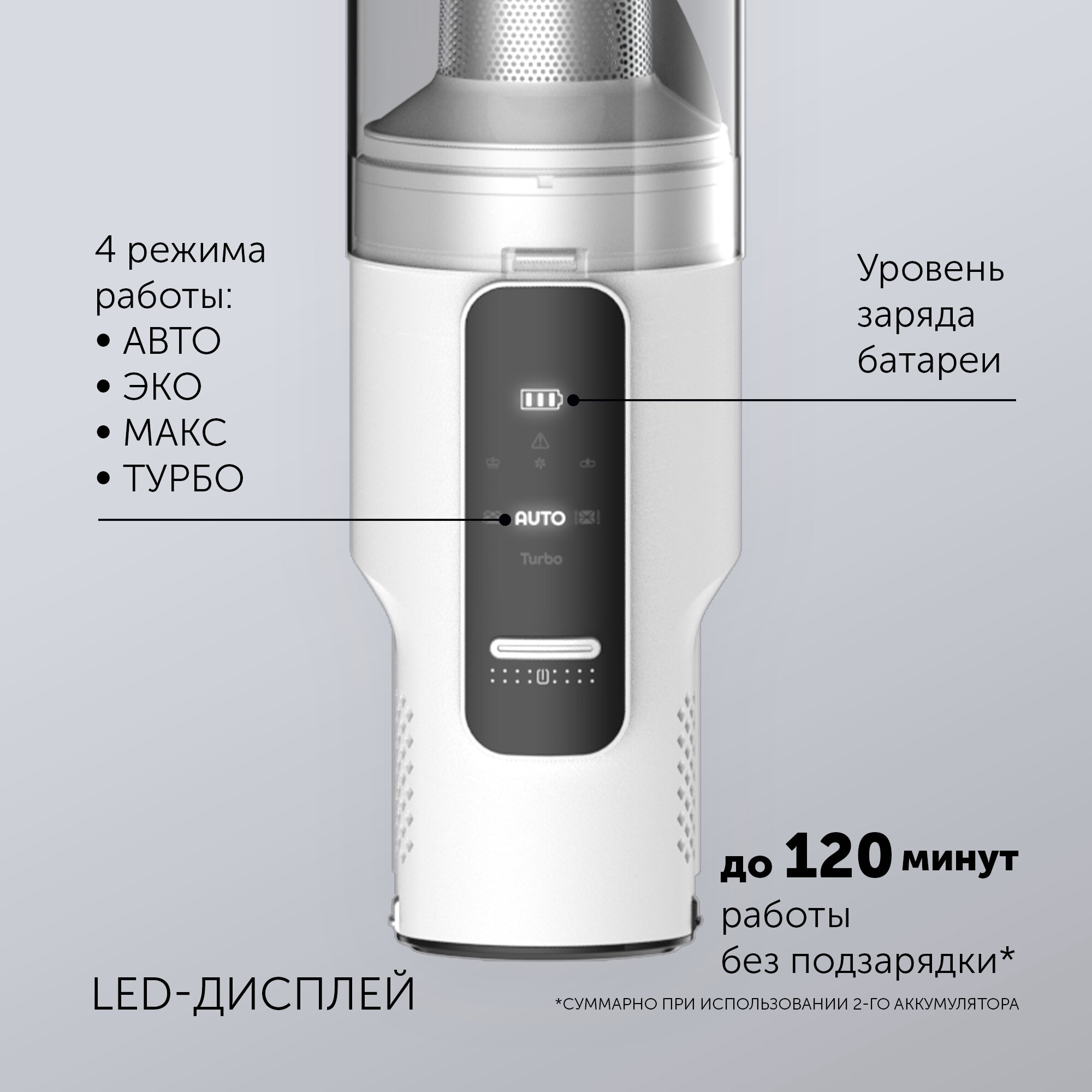 | Дополнительная информация | вертикальная парковка, индикатор заполнения пылесборника, регулировка мощности, насадка с LED подсветкой, съемный ручной пылесос, сменный аккумулятор в комплекте, подсветка зоны уборки, светодиодный дисплей |