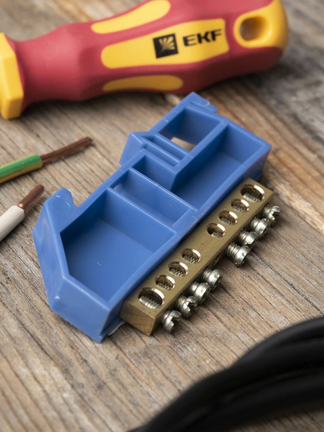 Шина нулевая "0" N (6х9мм) 8 отверстий латунь синий изолятор на DIN-рейку розничный стикер EKF PROxima - 1 шт интересное: