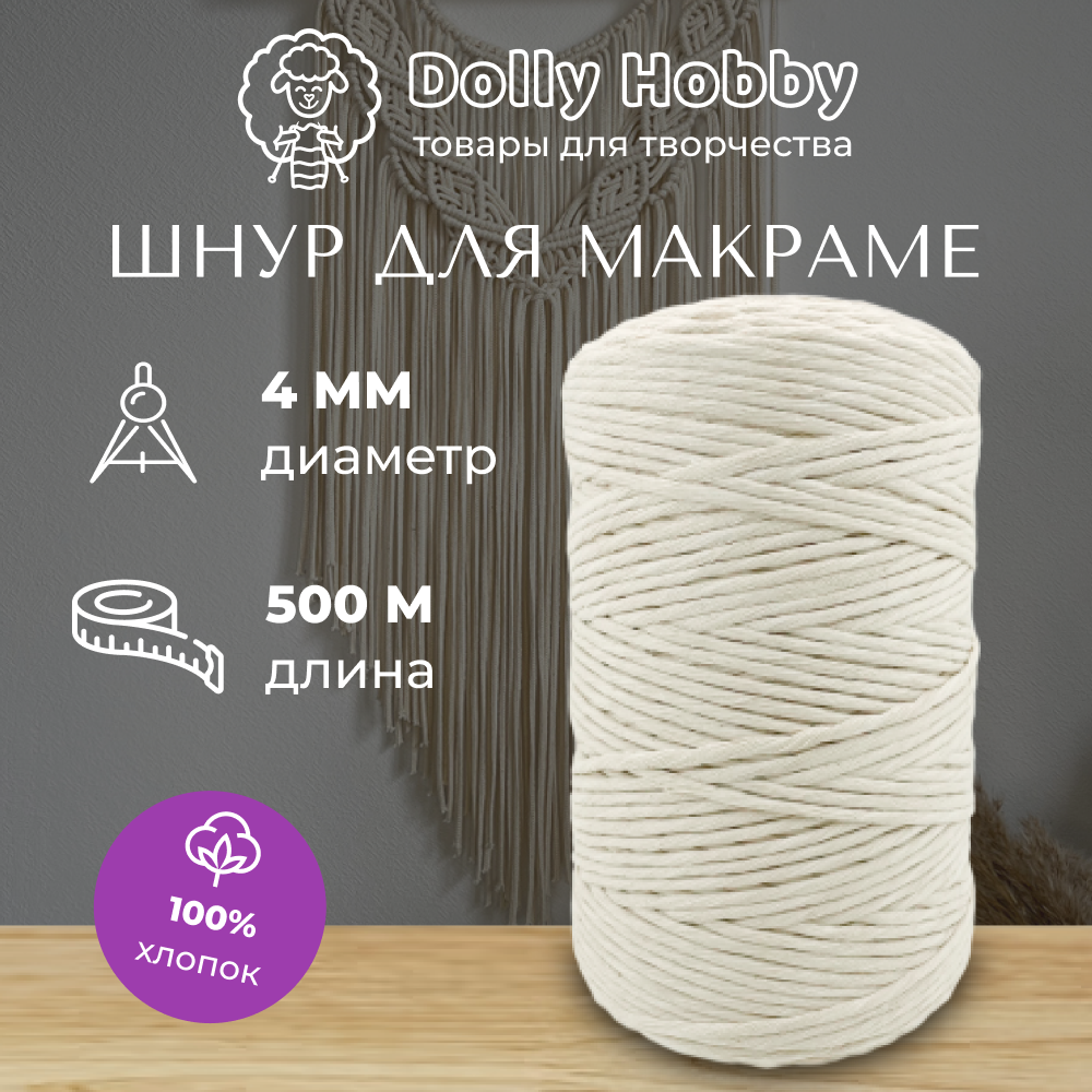 Шнур для макраме и рукоделия Dolly Hobby 100% хлопок 100м/ 4мм/ молочный