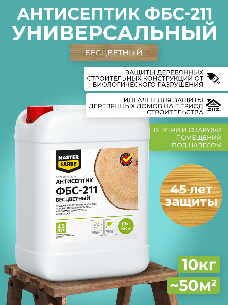 Антисептик MASTERFARBE ФБС-211 для защиты древесины от синевы и плесени, экологичный, бесцветный 10 кг