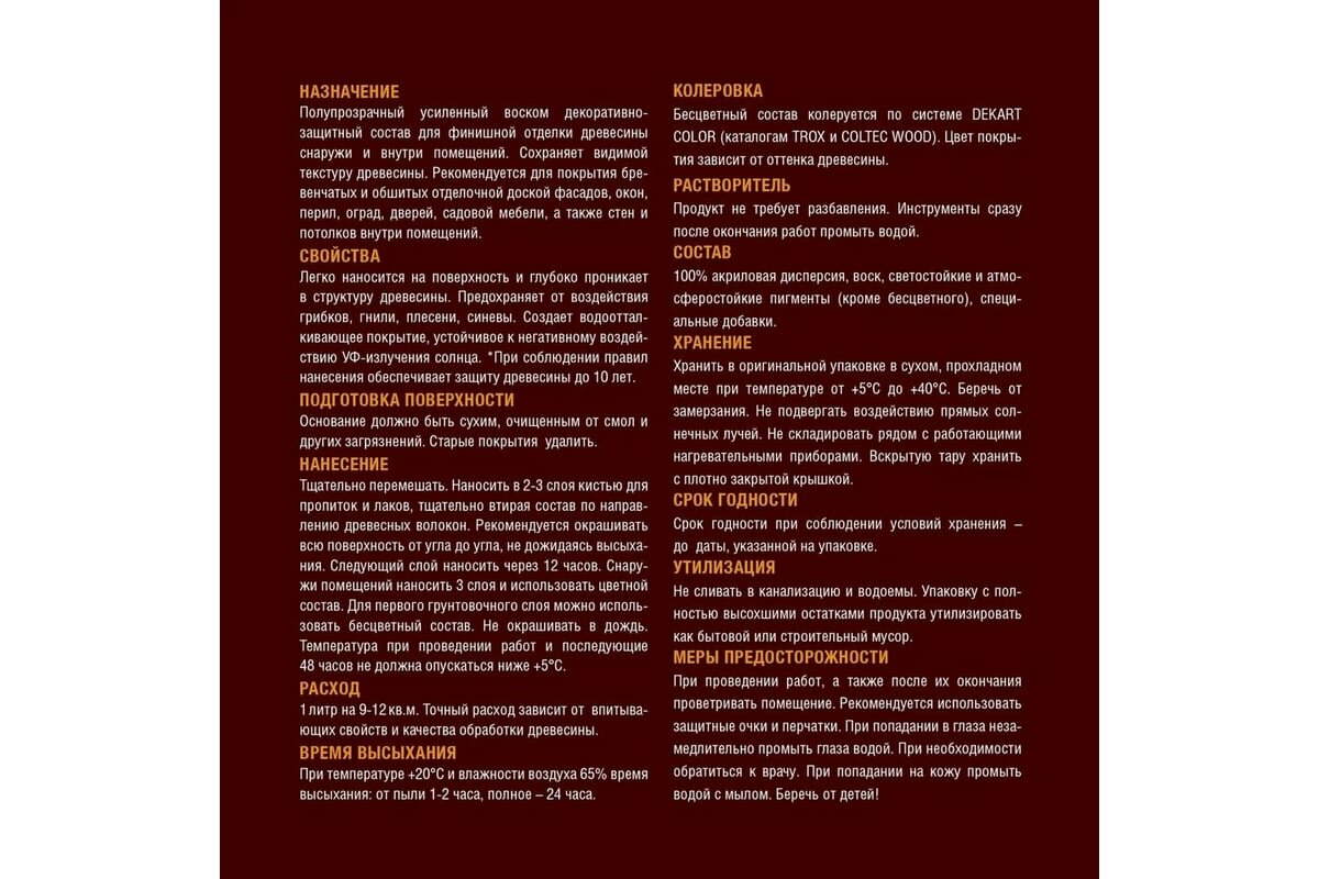 | Дополнительная информация | расход: пиленая древесина - 1 литр на 6-8 кв.м., строганая древесина - 1 литр на 9-12 кв.м. |