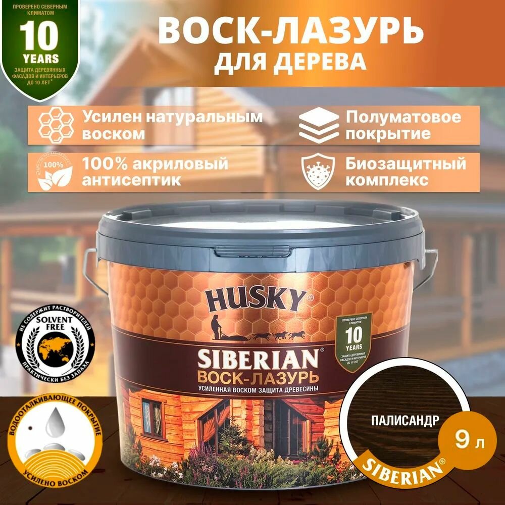 Купить Хаски / Воск-лазурь для древесины, пропитка антисептик для дерева, декоративно-защитный состав HUSKY SIBERIAN палисандр (9л)