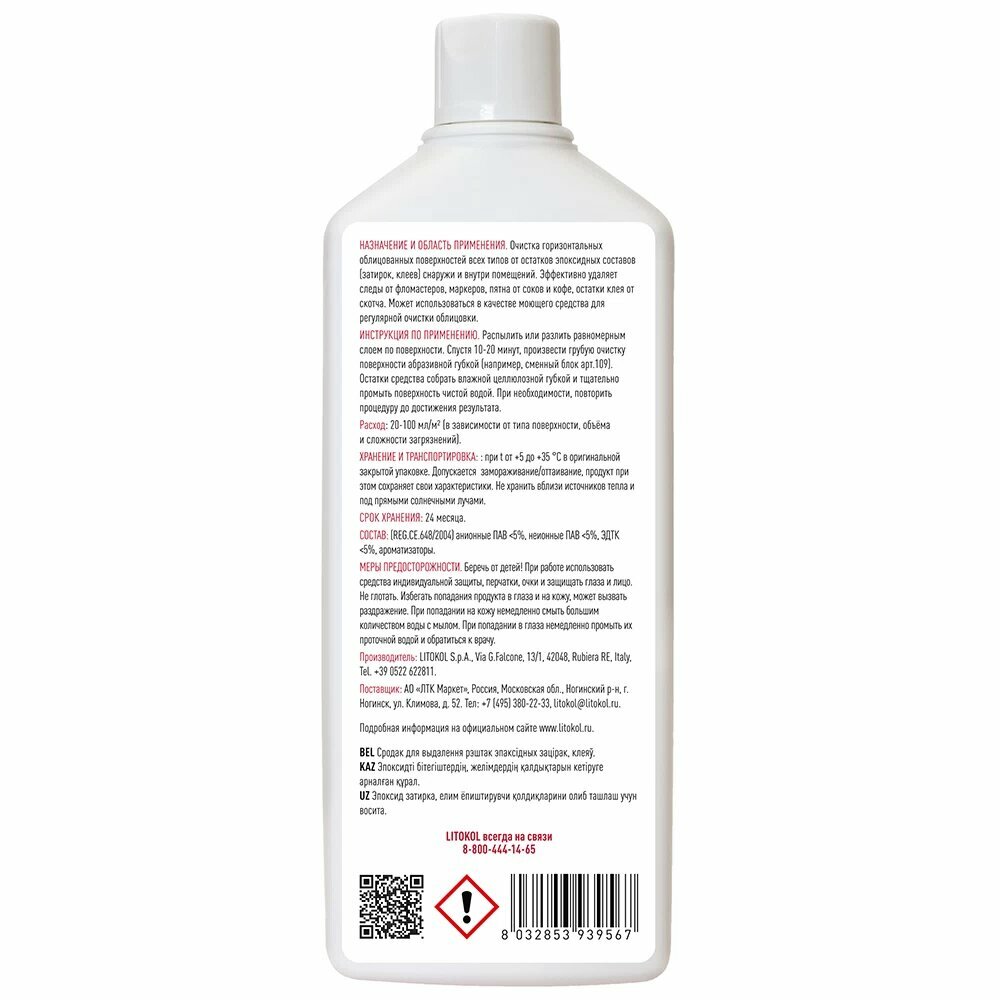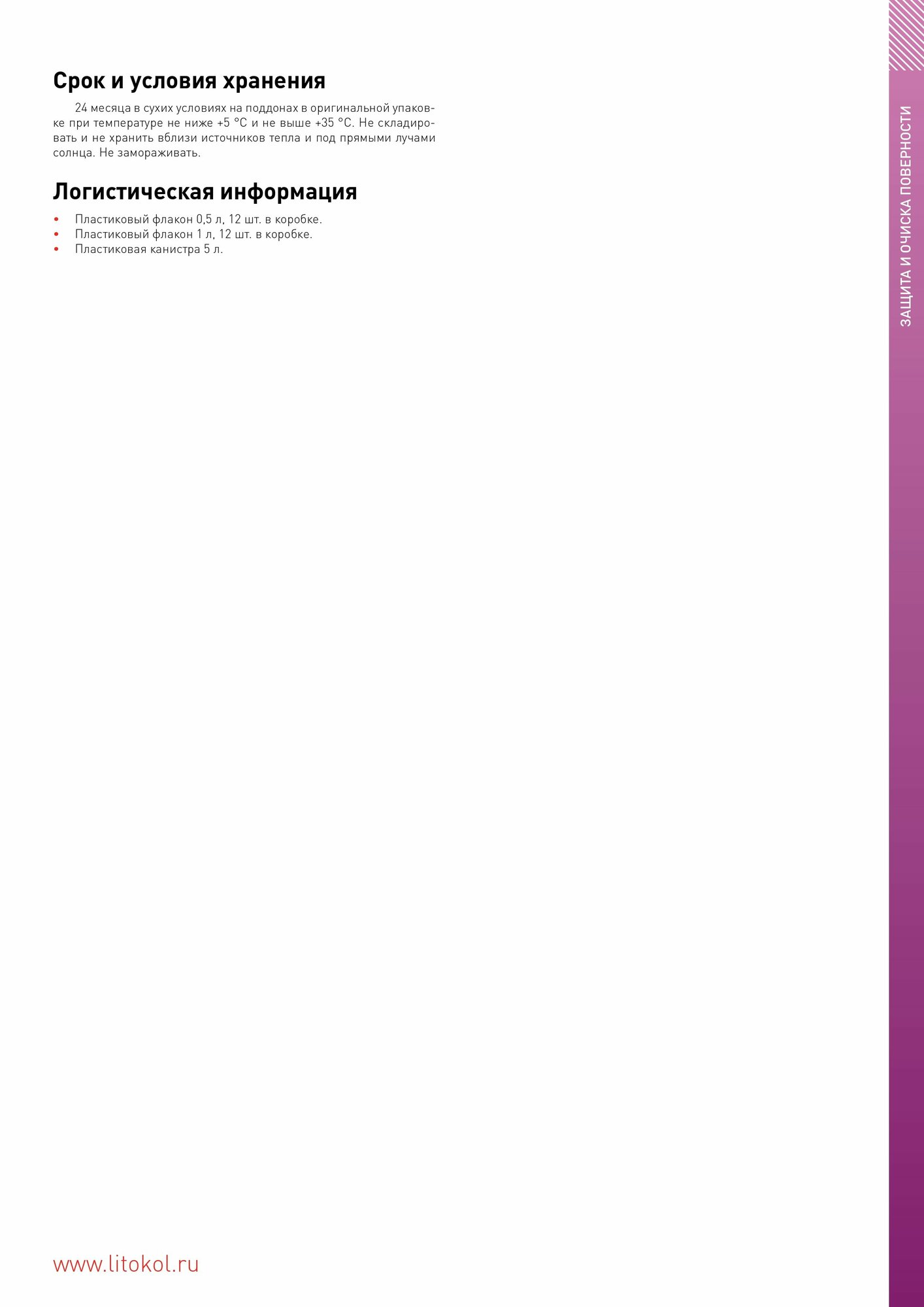 | Дополнительная информация | при разведении LITONET EVO с чистой водой, в пропорции от 1:10 до 3:10, может использоваться в качестве обезжиривающего щелочного моющего средства, которое идеально подходит для регулярной и частой очистки поверхностей от устойчивых загрязнений; PH раствора: 12 ± 0,5; температура применения: от +5 °C до +35 °C; время воздействия: 10-15 минут |