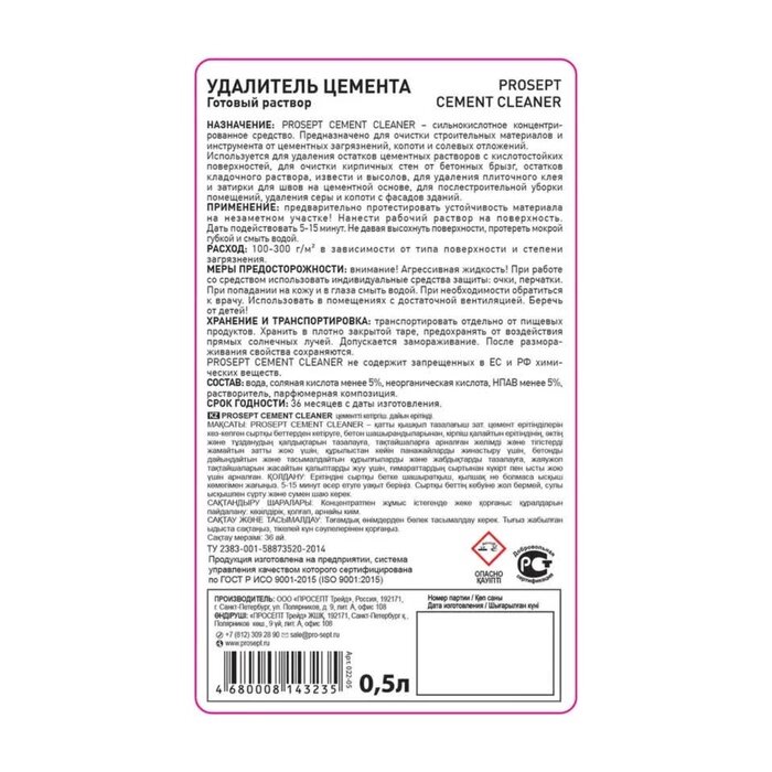 СохранитьProsept Cement Cleaner - удалитель цемента. Готовый состав. 0,5л 022-05 интересное: