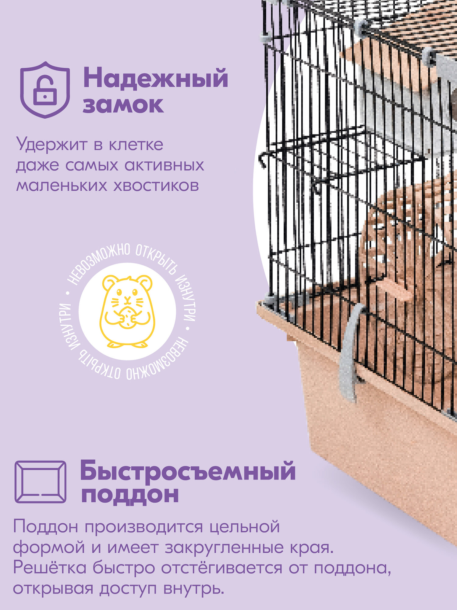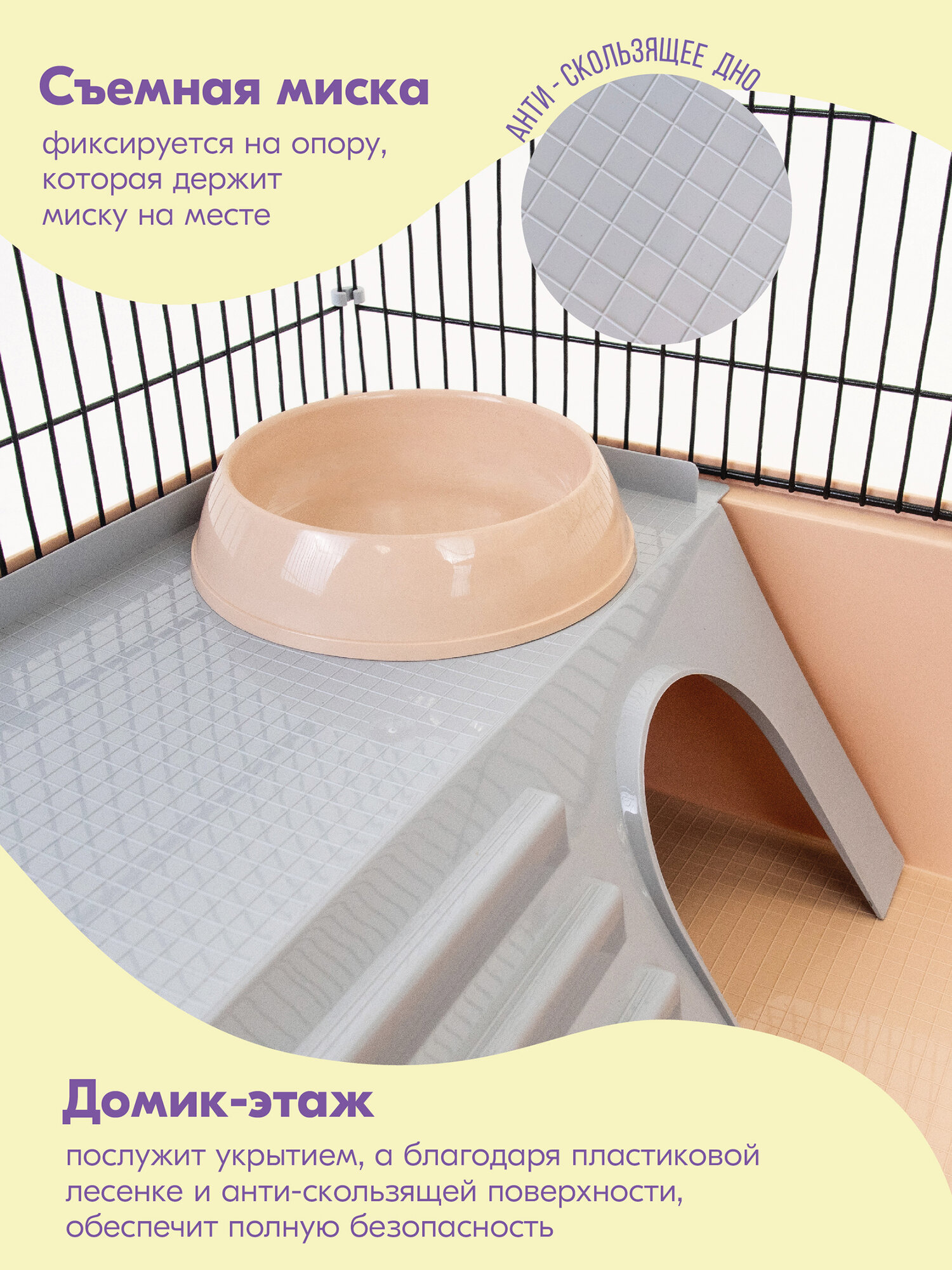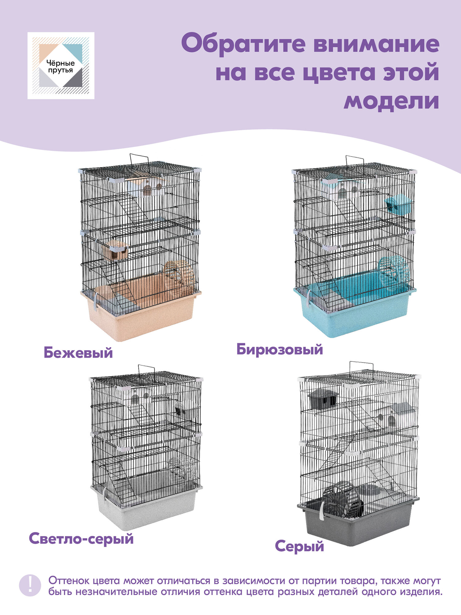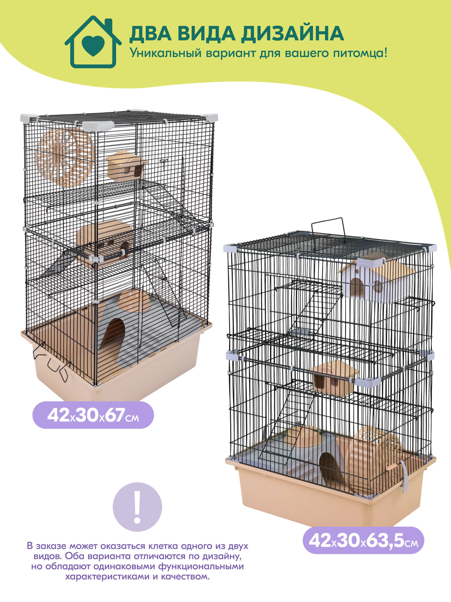 Клетка для грызунов "PetTails" разборная, шаг прута 10,5мм, 42*30*h67см, 3 этажа (+полка-домик, колесо, миска, 2 пласт. домика) бежевая