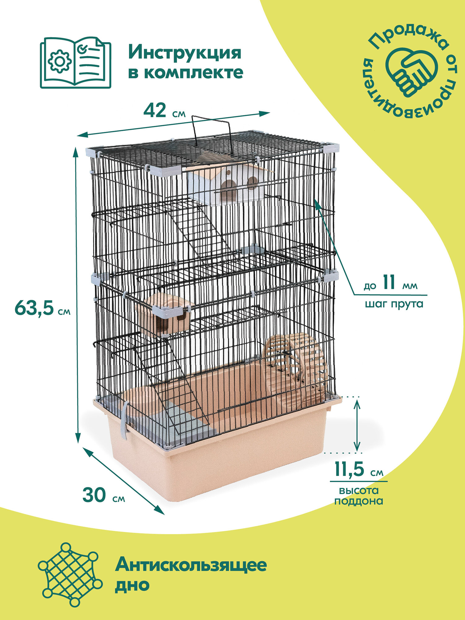 Купить Клетка для грызунов, "PetTails", разборная, шаг прута 10,5мм, 42*30*h63,5см, 3 этажа (+полка-домик, колесо, миска, 2 пласт. домика) бежевая