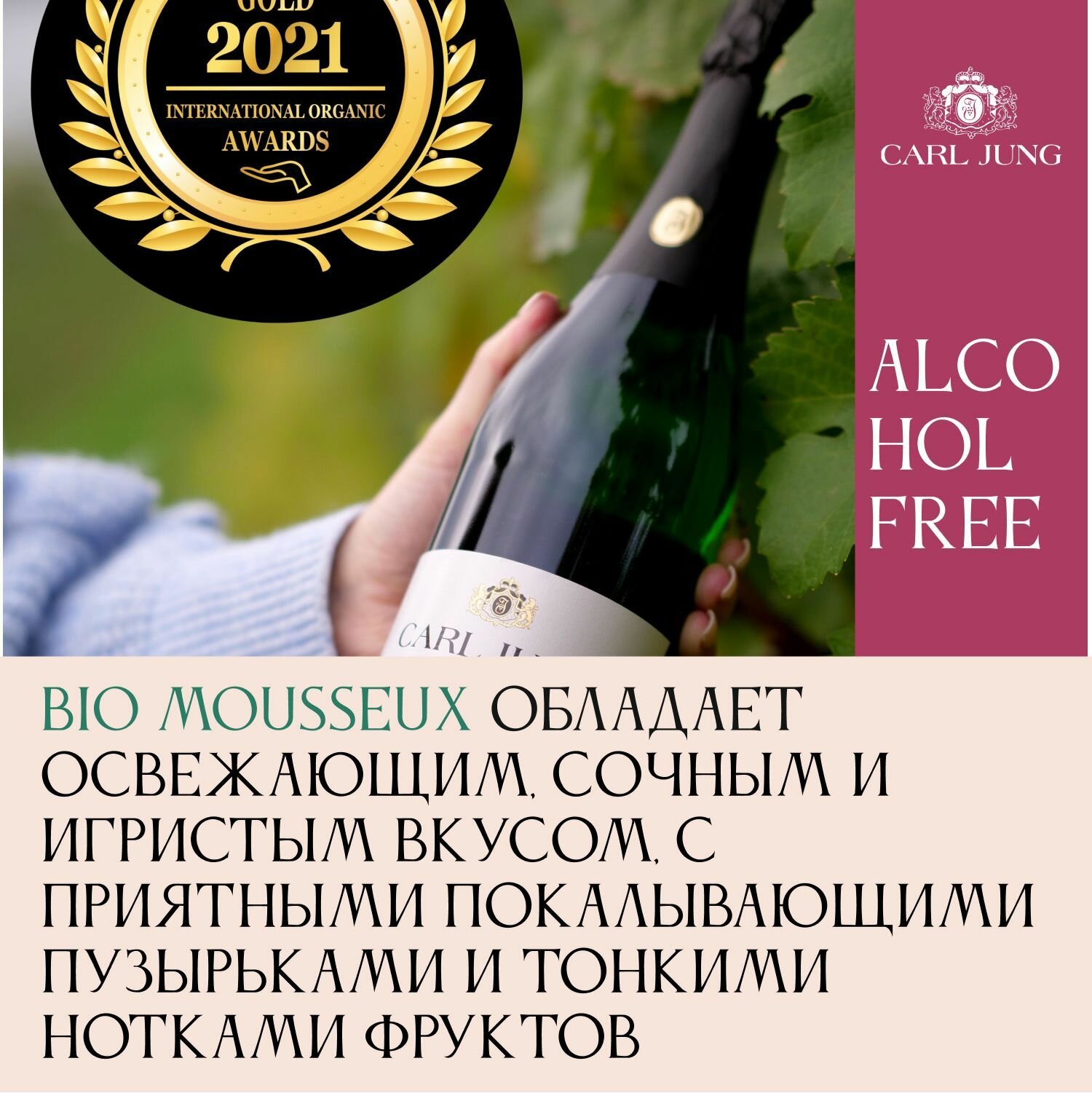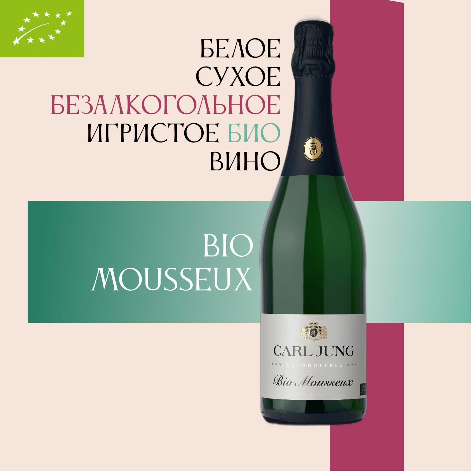 Шампанское 100% натуральное, безалкогольное Carl Jung Bio Mousseux (Био Мусё) серии BIO (БИО) игристое вино сухое, Германия, 750 мл