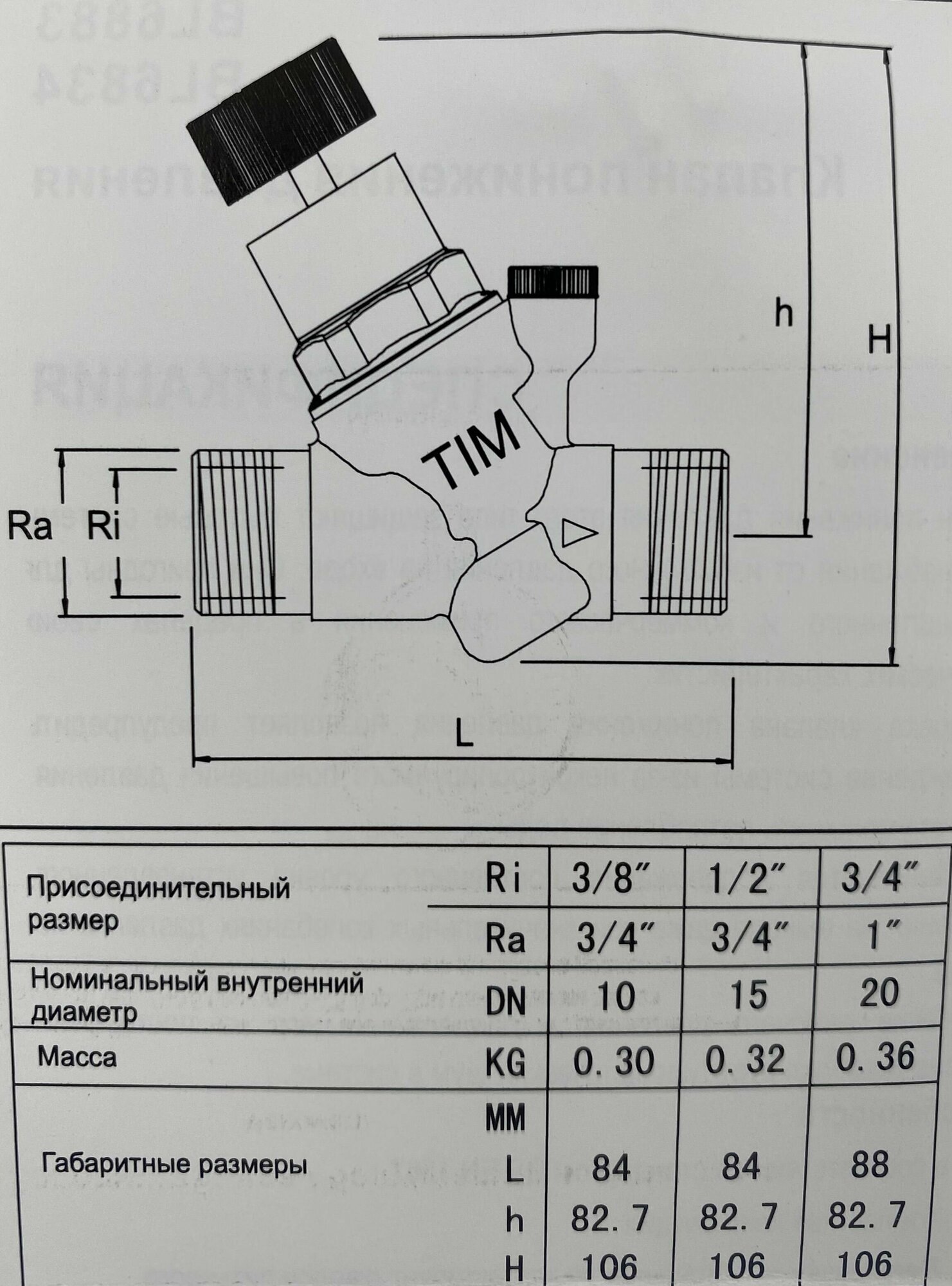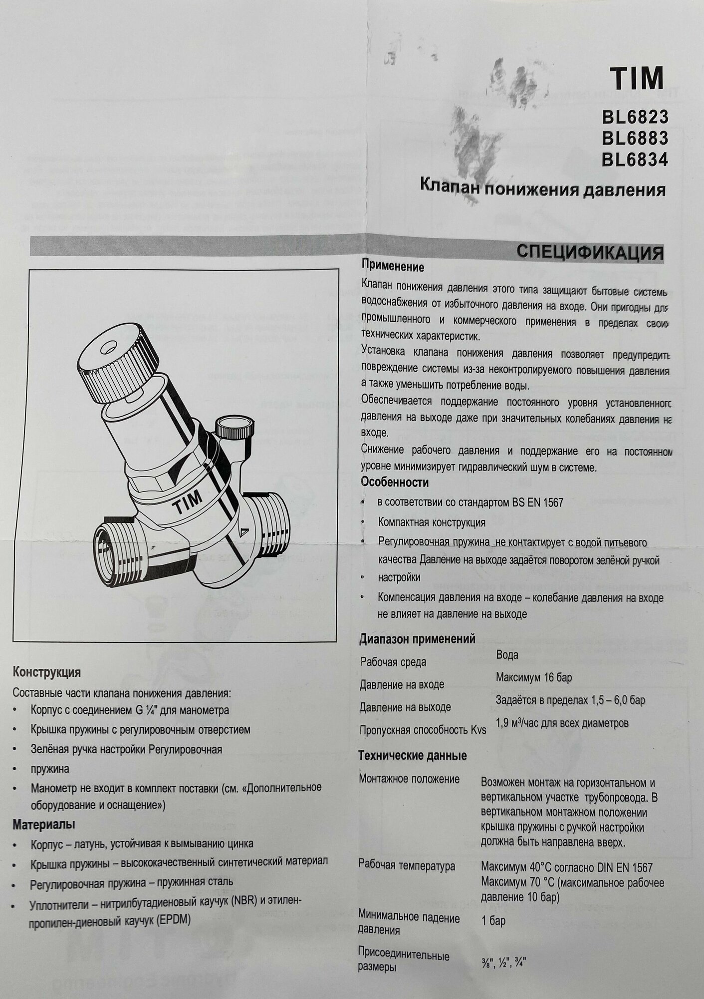 Редуктор давления Tim BL6823A муфтовый (ВР/НР) Ду 20 (3/4") интересное: