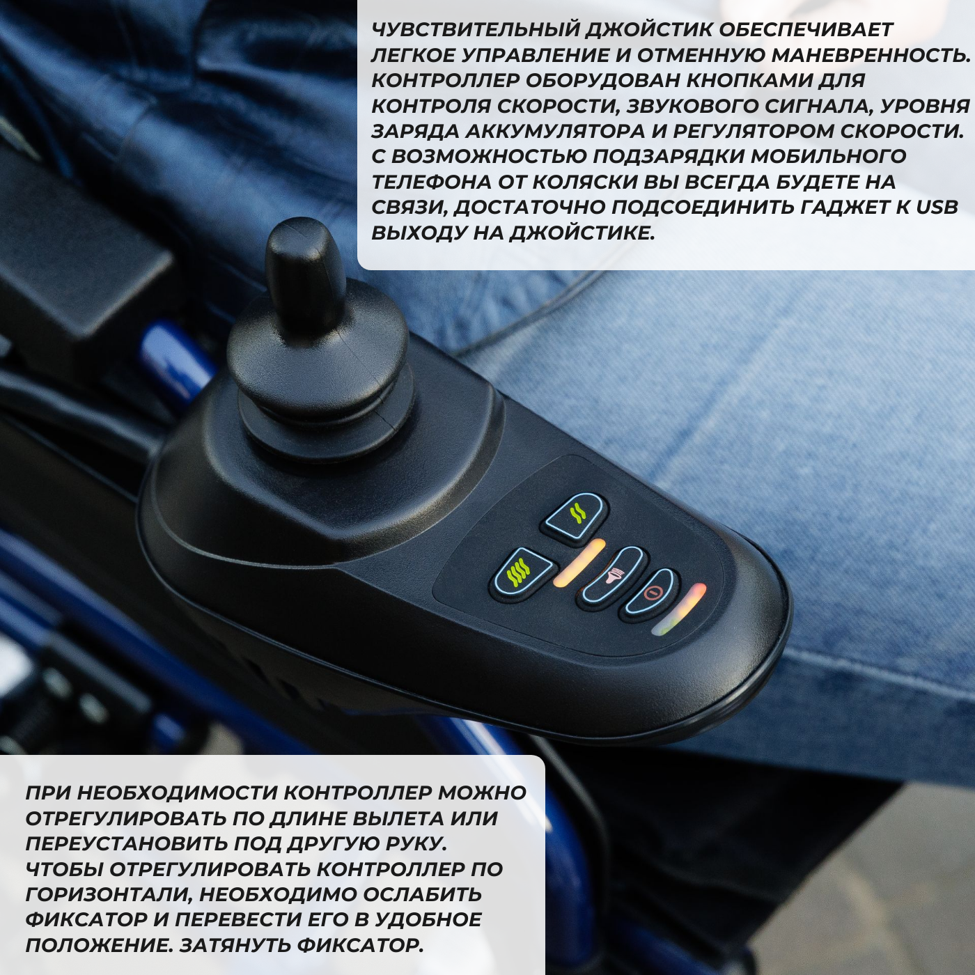| Дополнительная информация | Пульт управления, регулируемый по длине вылета, USB-выход для зарядки мобильных устройств, Ремень для голени, Крылья на задних колесах, Легкосъемный бокс с аккумуляторами, Задние колеса с внедорожным протектором |