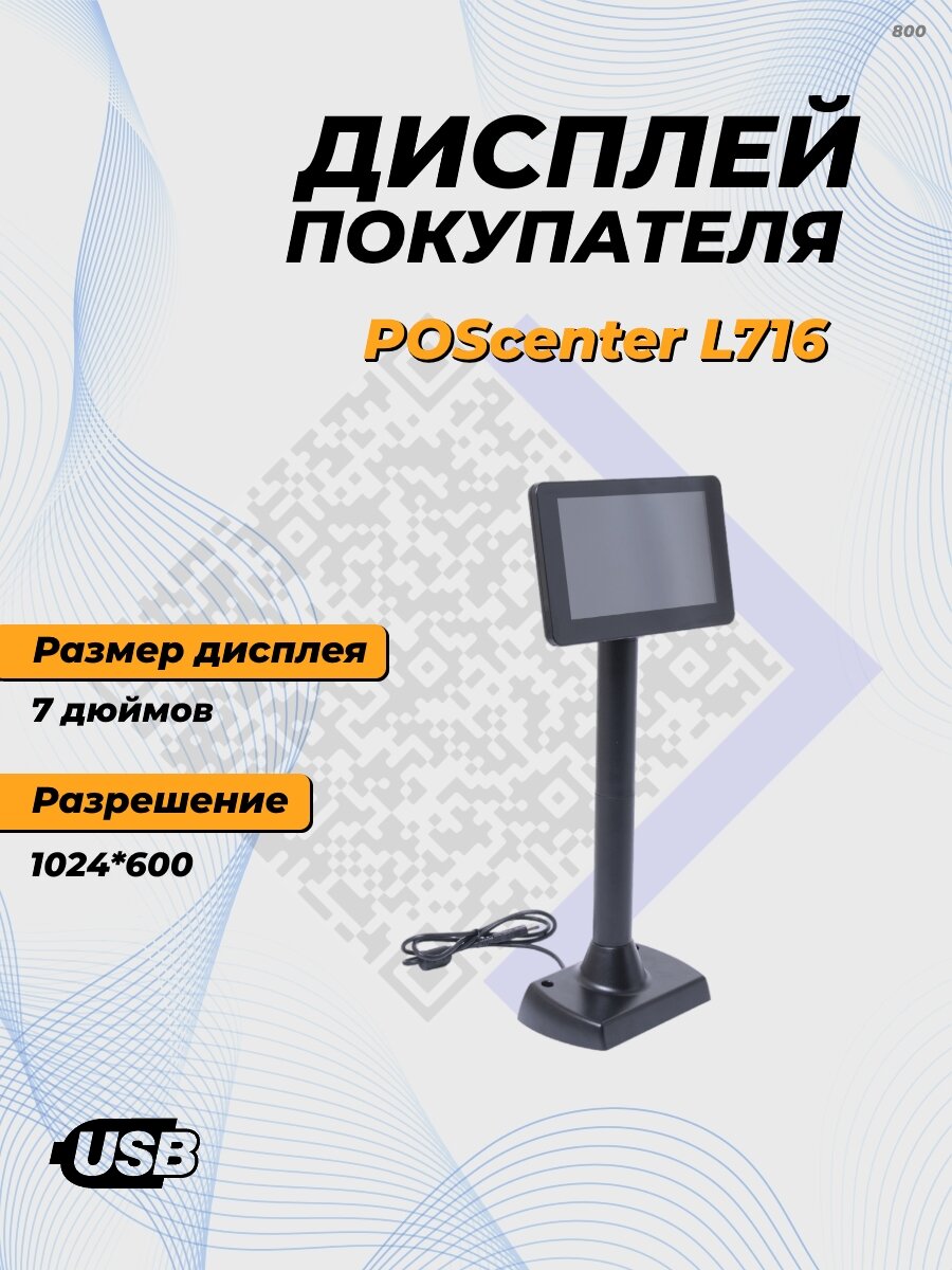 Дисплей покупателя Poscenter L716, цветной, 1024*600, дисплей LCD 7", кабель USB, черный интересное: