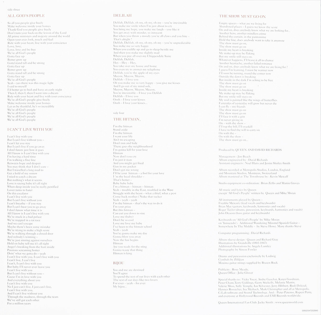 | Треклист | A1. Innuendo A2. I'm Going Slightly Mad A3. Headlong B1. These Are The Days Of Our Lives B2. Don't Try So Hard B3. Ride The Wild Wind C1. All God's People C2. I Can't Live With You C3. Delilah D1. The Hitman D2. Bijou D3. The Show Must Go On |