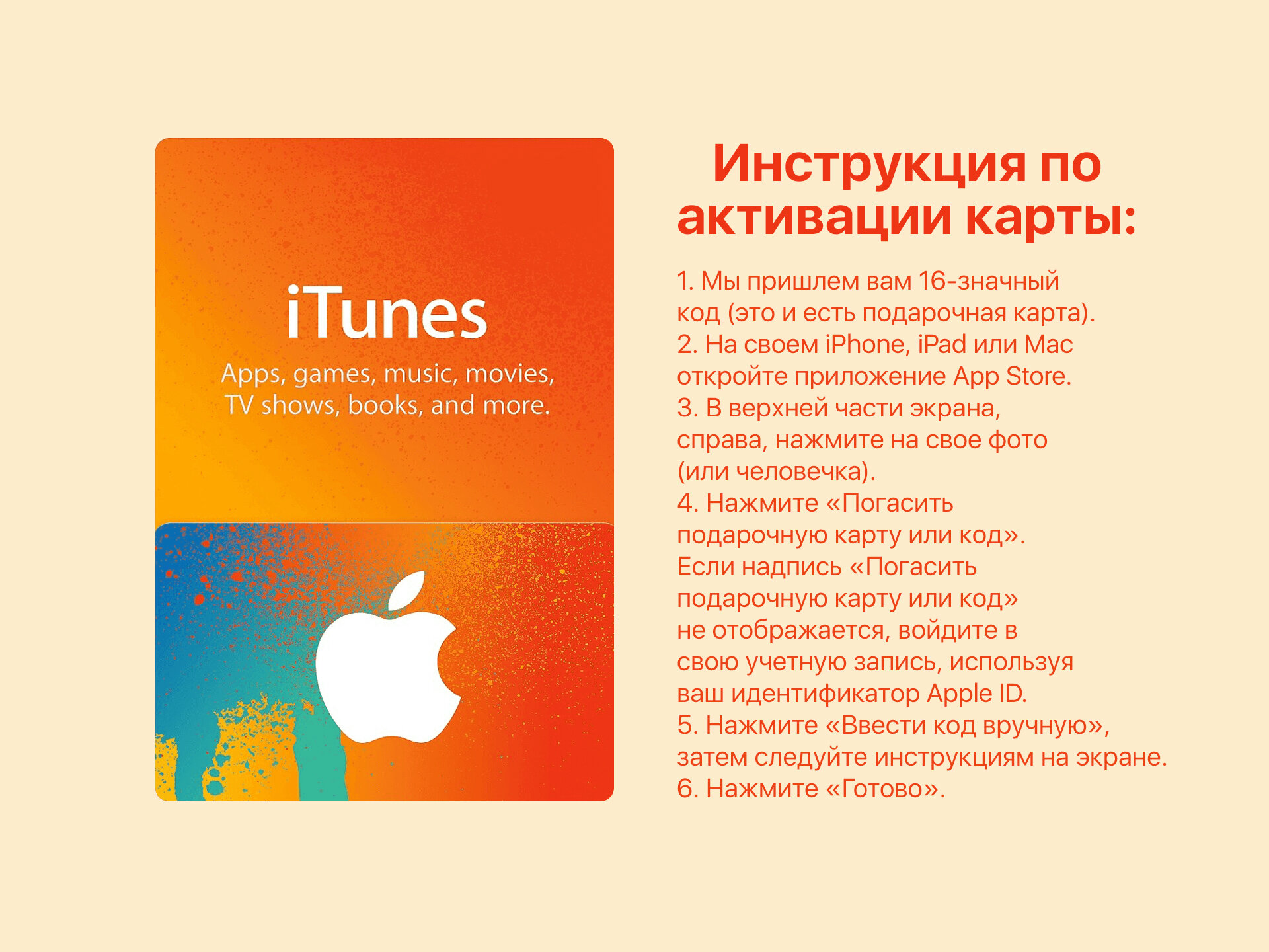| Инструкция по активации | 1) Перейдите на страницу apple.com/redeem. 2) Авторизуйтесь под своим аккаунтом или зарегистрируйтесь. 3) Введите цифровой код и нажмите кнопку «Активировать». |