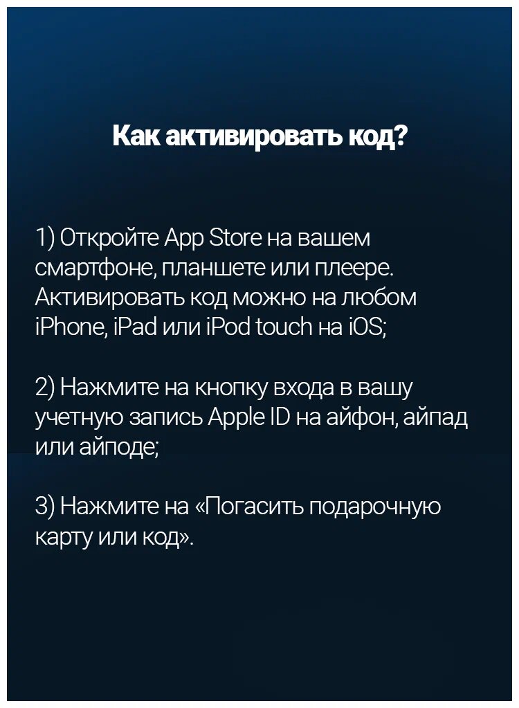 | Инструкция по активации | Откройте приложение App Store. В верхней части экрана нажмите кнопку входа или свое фото. Нажмите «Погасить подарочную карту или код». Если надпись «Погасить подарочную карту или код» не отображается, войдите в учетную запись с помощью идентификатора Apple ID |