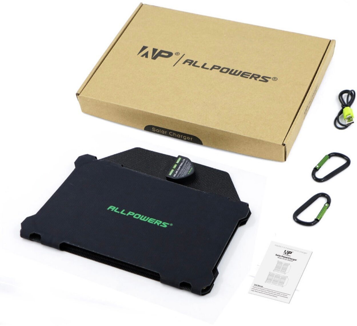| Подробная комплектация | 1 х складная солнечная панель ALLPOWERS 60 Вт 1 х зажим типа «крокодил» 1 х разъемов для ноутбуков и электростанций 1 х инструкция по эксплуатации |