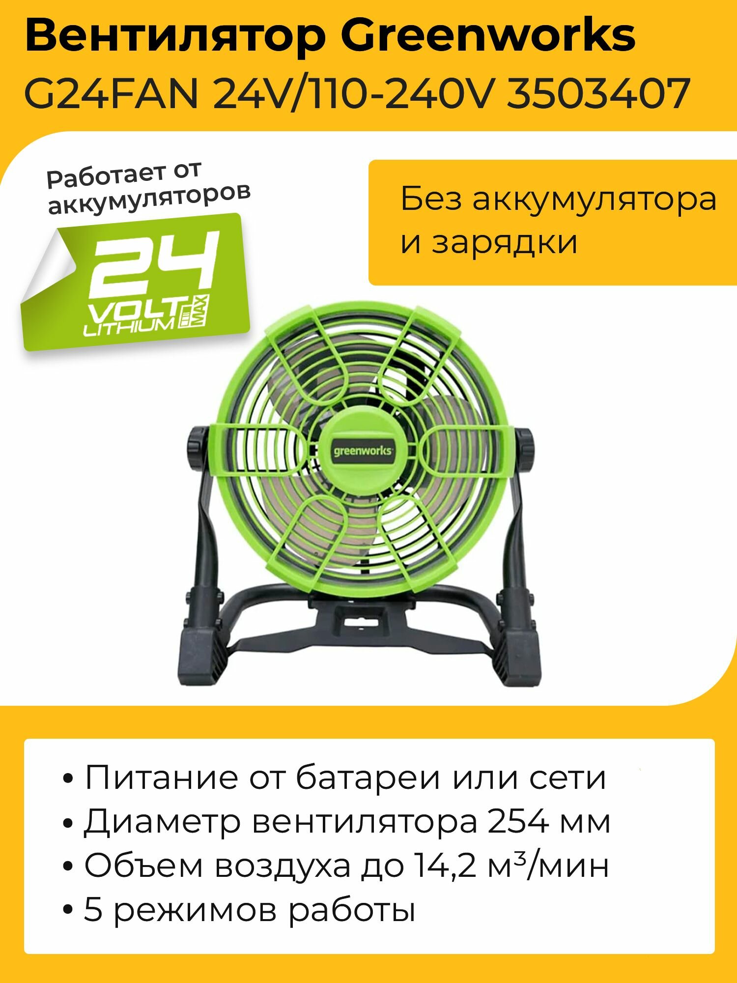 Аккумуляторный вентилятор Greenworks G24FAN, 24 В, c возможностью питания от сети, 254 мм, 14.2 м/мин, без АКБ и ЗУ, 3503407