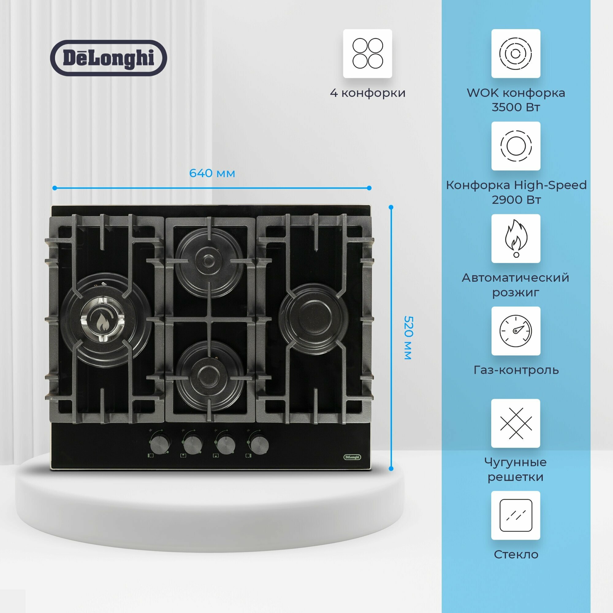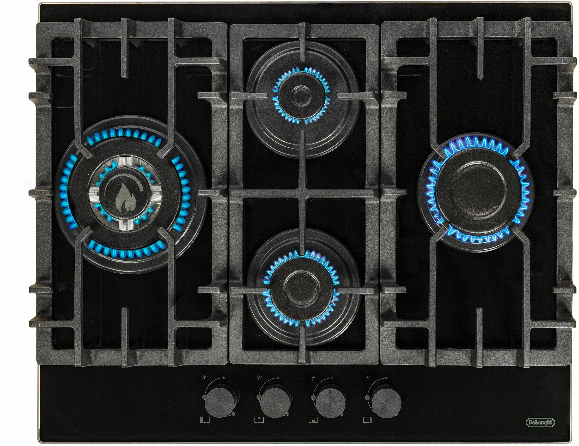 Газовая варочная панель DeLonghi GABRIELLA 6GW NB, 64 см, черная, WOK-конфорка, чугунные решетки, автоматический розжиг, газ-контроль