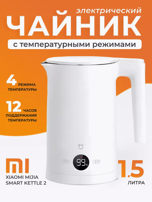 Чайник Xiaomi Mijia Thermostatic Electric Kettle 2, CN, белый, универсальный переходник в комплекте интересное: