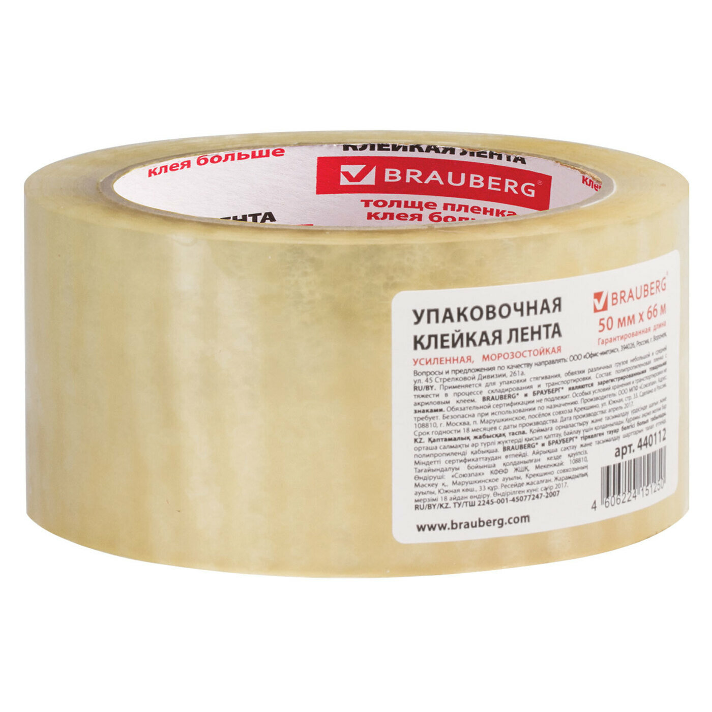 BRAUBERG Клейкая лента 50 мм х 66 м, упаковочная, усиленная, морозостойкая, прозрачная, 50 мкм, 440112