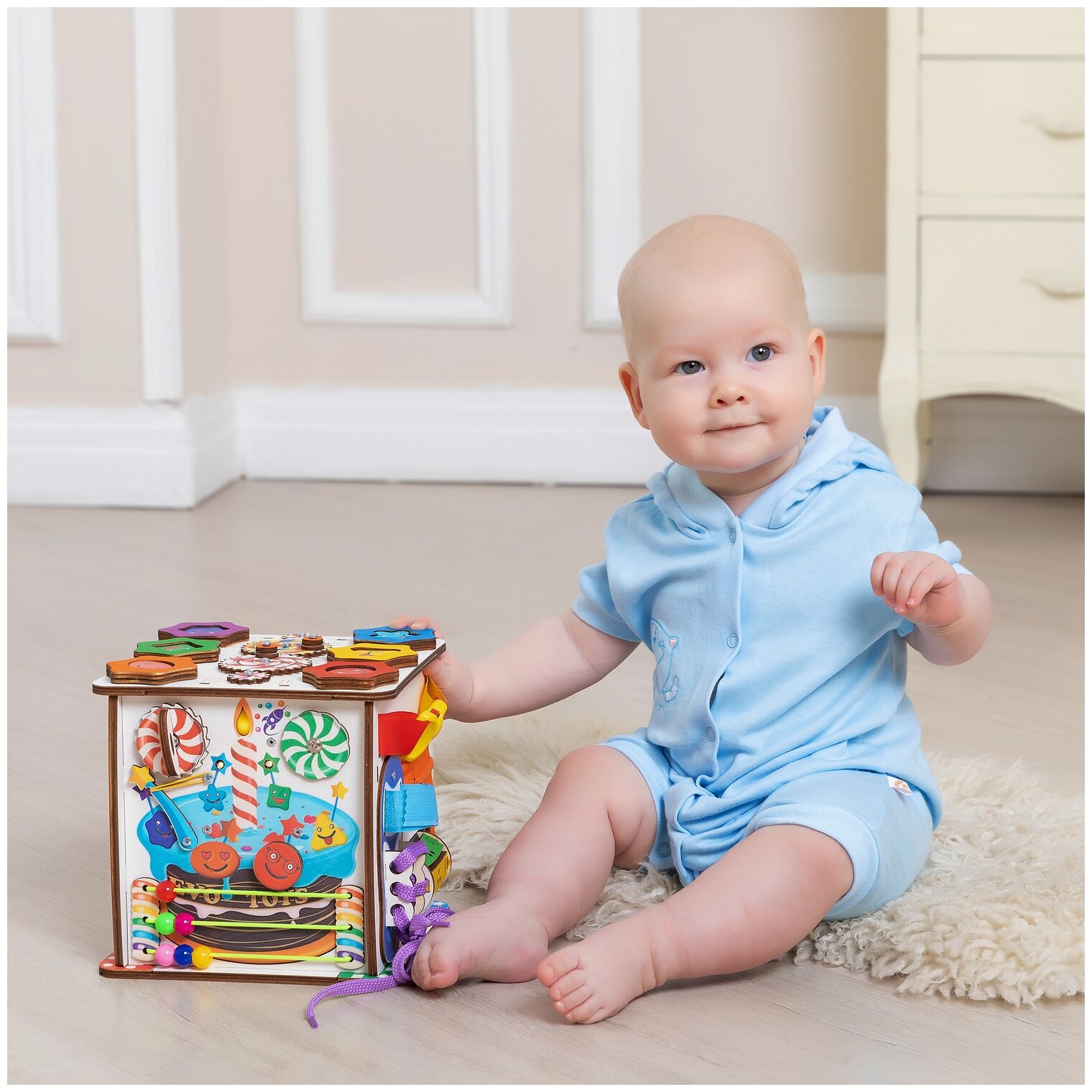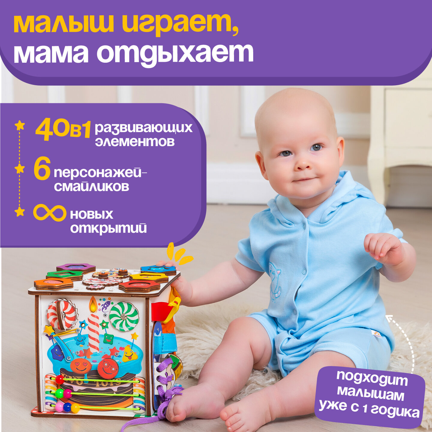 Бизиборд кубик развивающий Evotoys Смайлики на дне рождения со светом для малышей
