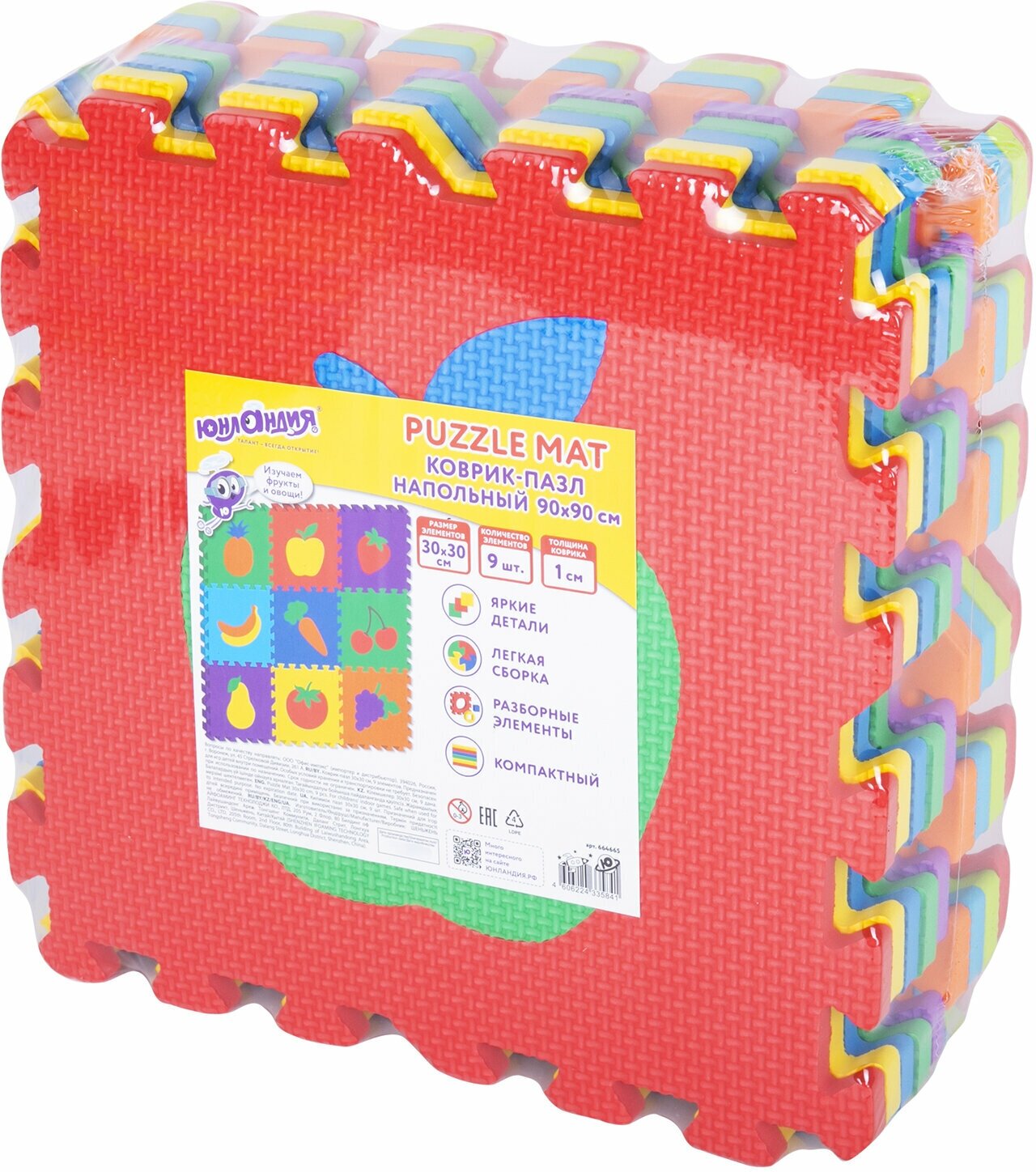 Коврик-пазл напольный 0,9х0,9 м мягкий "Фрукты-овощи", 9 частей 30х30 см, толщина 1 см, юнландия, 664665