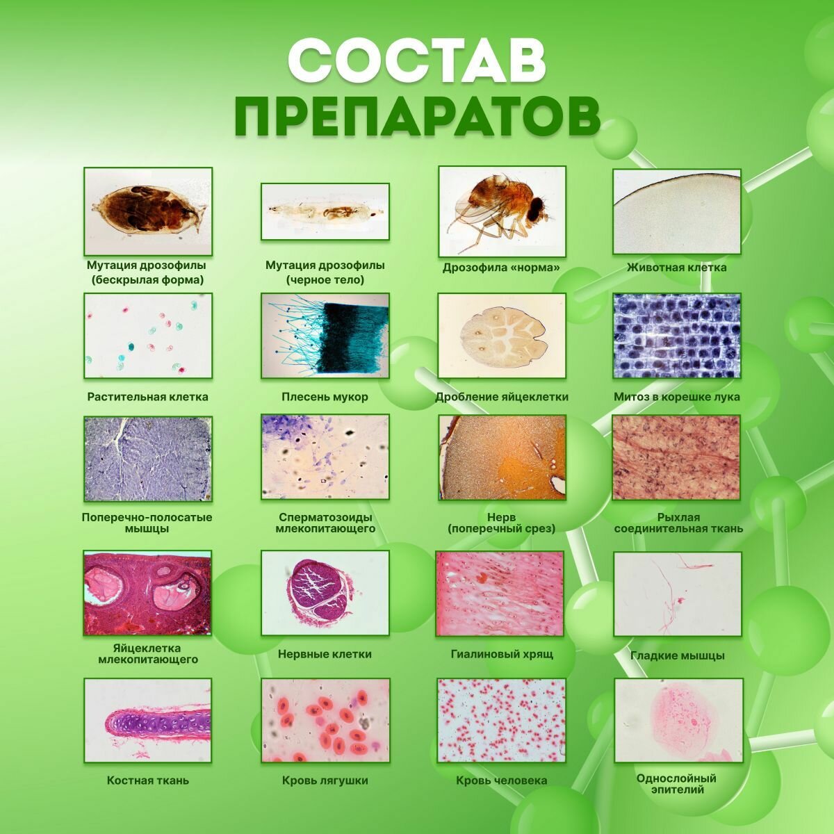 | Дополнительная информация | в наборе микропрепаратов: мутация дрозофилы (бескрылая форма), мутация дрозофилы (черное тело), дрозофила «норма», животная клетка. растительная клетка, плесень мукор, дробление яйцеклетки, митоз в корешке лука, поперечно-полосатые мышцы, сперматозоиды млекопитающего, нерв (поперечный срез), рыхлая соединительная ткань, яйцеклетка млекопитающего, нервные клетки, гиалиновый хрящ, гладкие мышцы, костная ткань, кровь лягушки, кровь человека, однослойный эпителий |