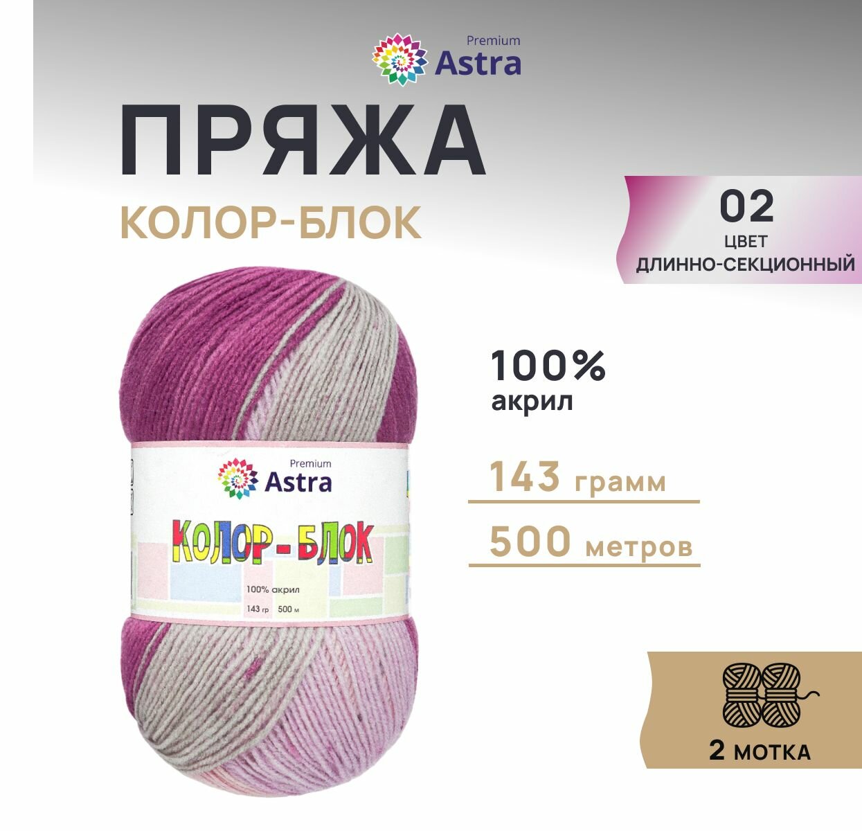 Купить Пряжа для вязания Astra Premium 'Колор-блок' 143г, 500м (100% акрил) (02 длинно-секционный), 2 мотка