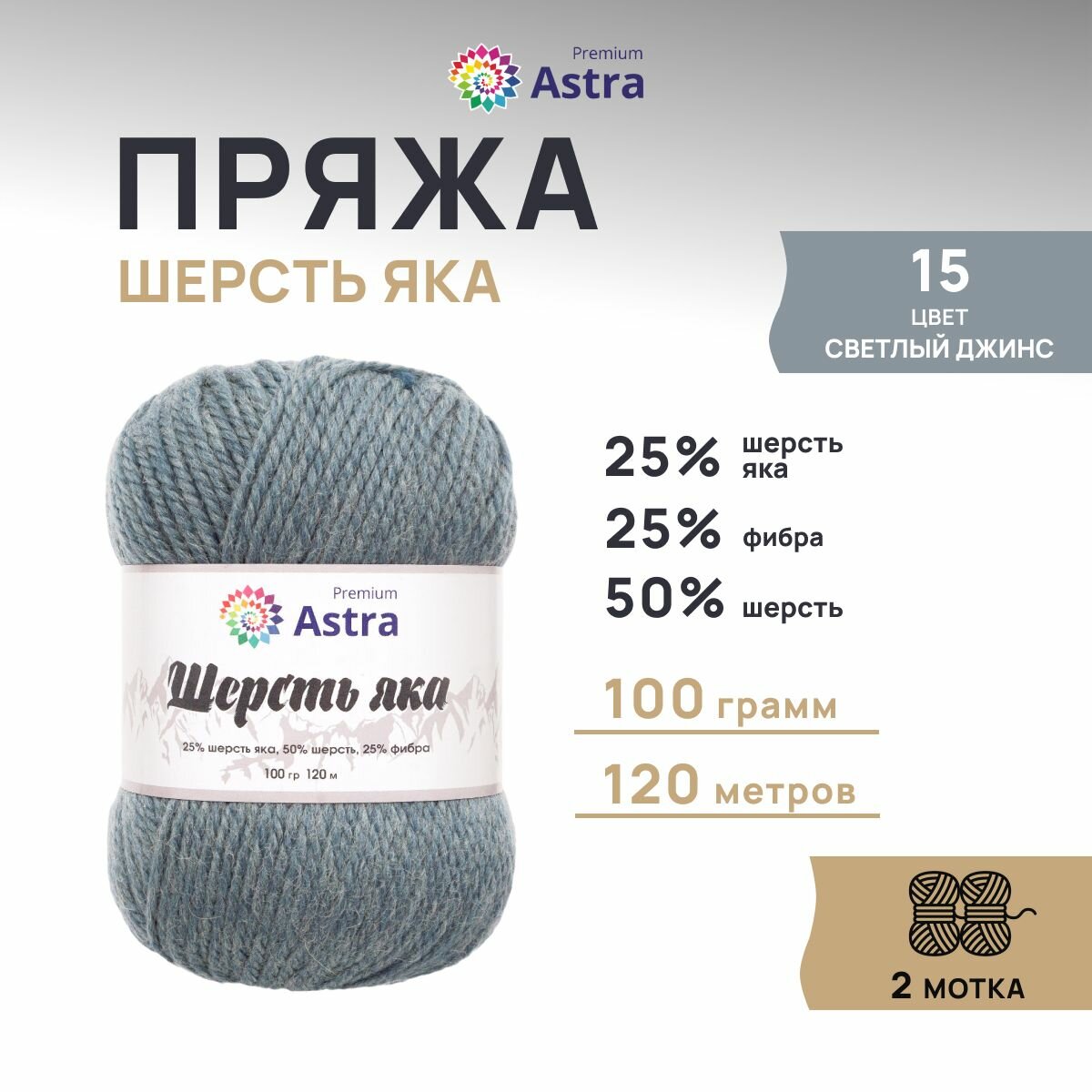 Пряжа для вязания Astra Premium 'Шерсть яка' (Yak wool) 100гр 120м (+/-5%) (25% шерсть яка, 50% шерсть, 25% фибра) (15 светлый джинс), 2 мотка