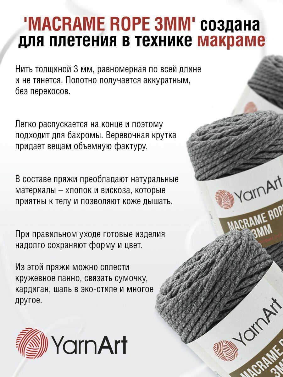 СохранитьПряжа для вязания YarnArt 'Macrame Rope 3мм' 250г, 63м (хлопок, вискоза, полиэстер) (758 антрацит), 4 мотка интересное: