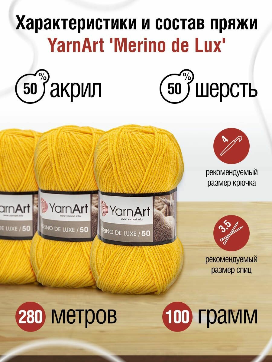 Пряжа MERINO DE LUXE 50 (YarnArt), желтый - 586, 50% шерсть, 50% акрил, 5 мотков, 100 г, 280 м.