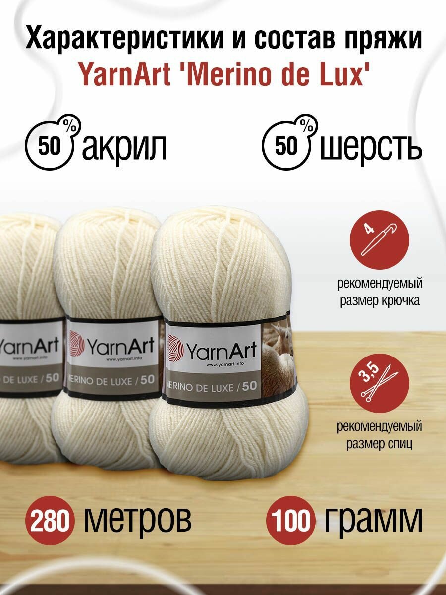 Пряжа MERINO DE LUXE 50 (YarnArt), кремовый - 7003, 50% шерсть, 50% акрил, 5 мотков, 100 г, 280 м.