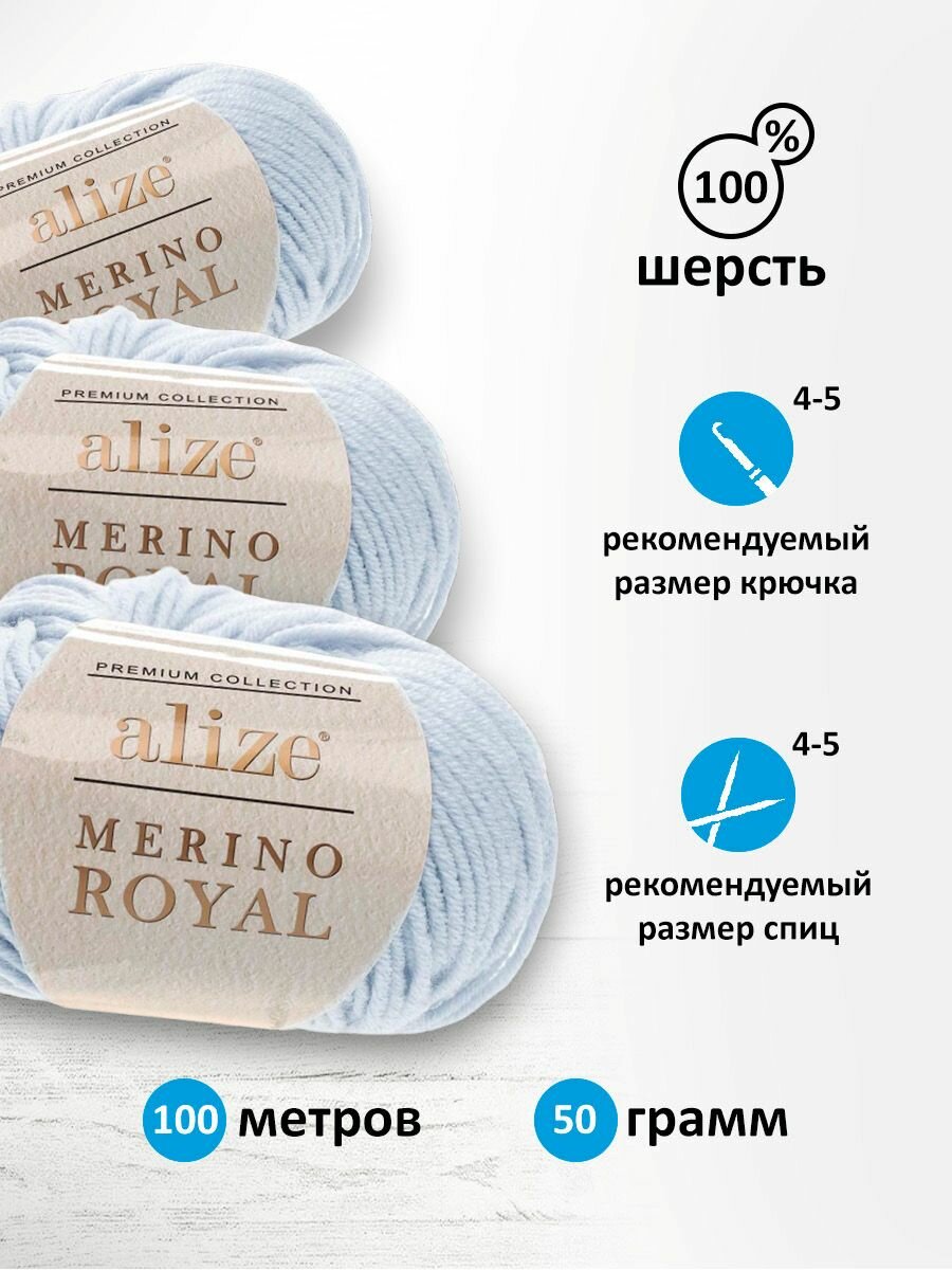 Пряжа Alize Merino Royal - 3 шт, 480 светло голубой, 100 м/50 г, 100% мериносовая шерсть /Ализе мерино роял/
