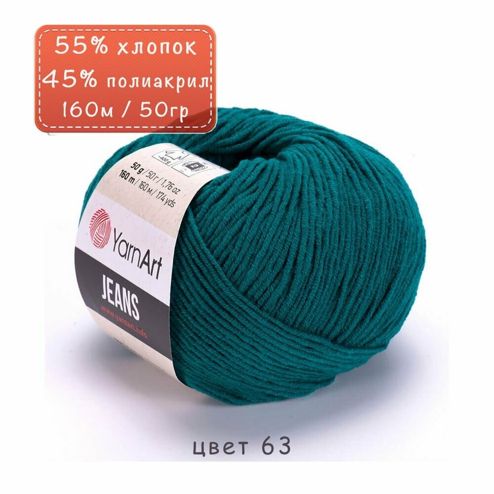 Пряжа "Jeans" цв. 63 изумрудный 55% хлопок 45% полиакрил 160м/50гр "YarnArt"