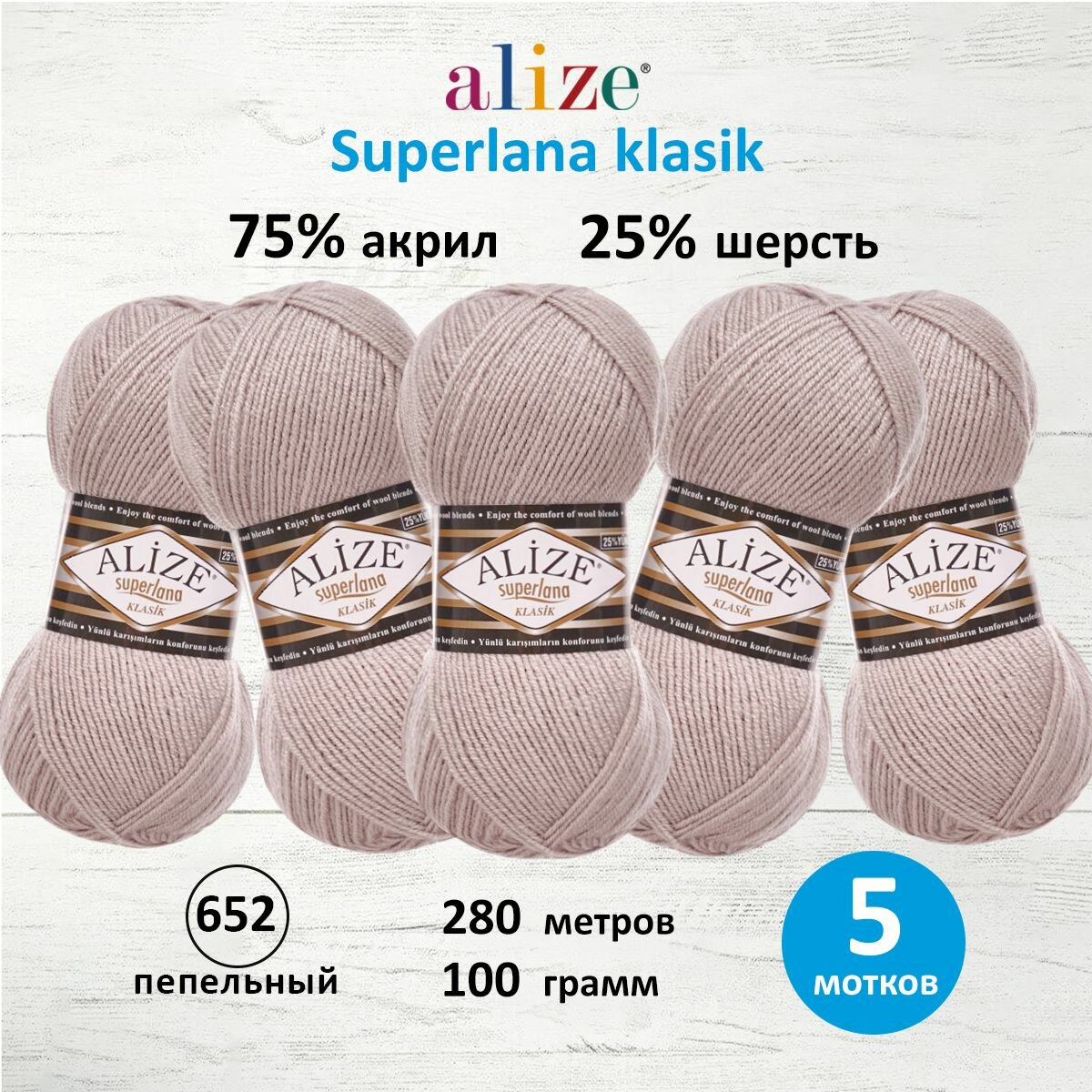 Купить Пряжа Alize Superlana klasik пепельный (652), 25%шерсть/75%акрил, 280м, 100г, 5шт